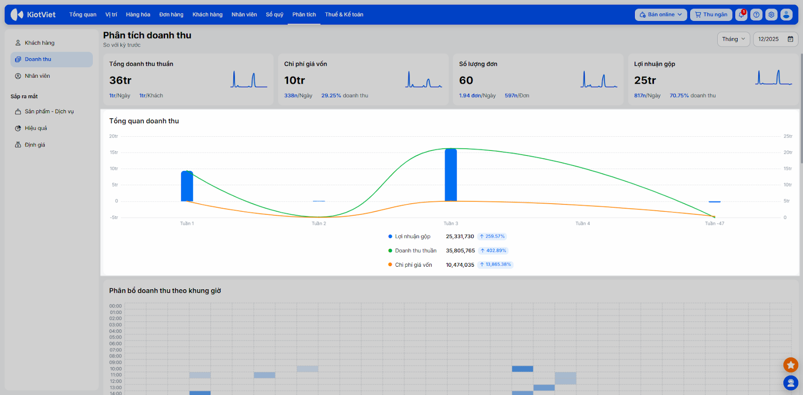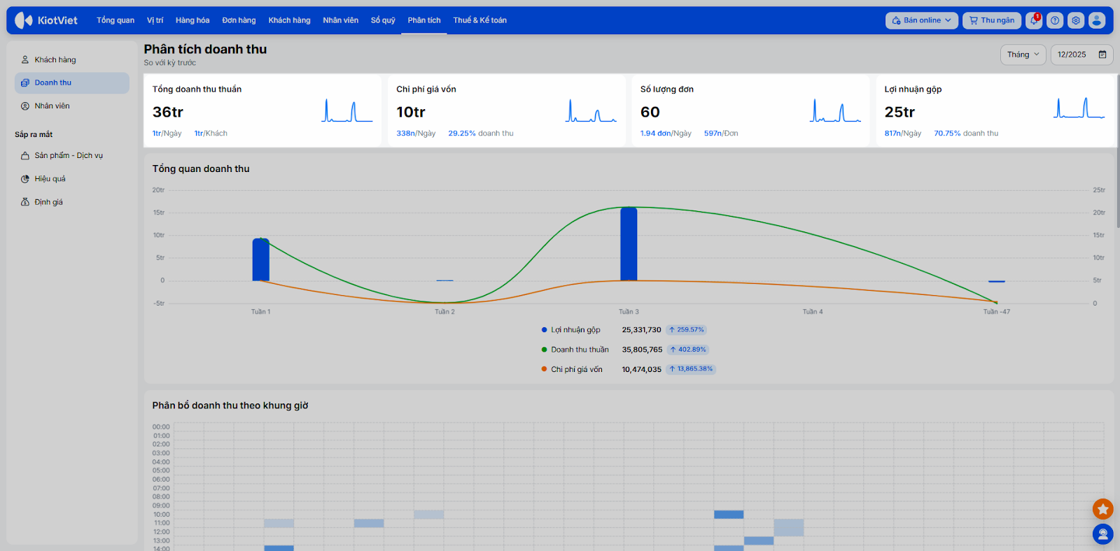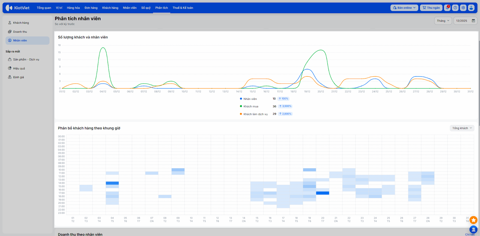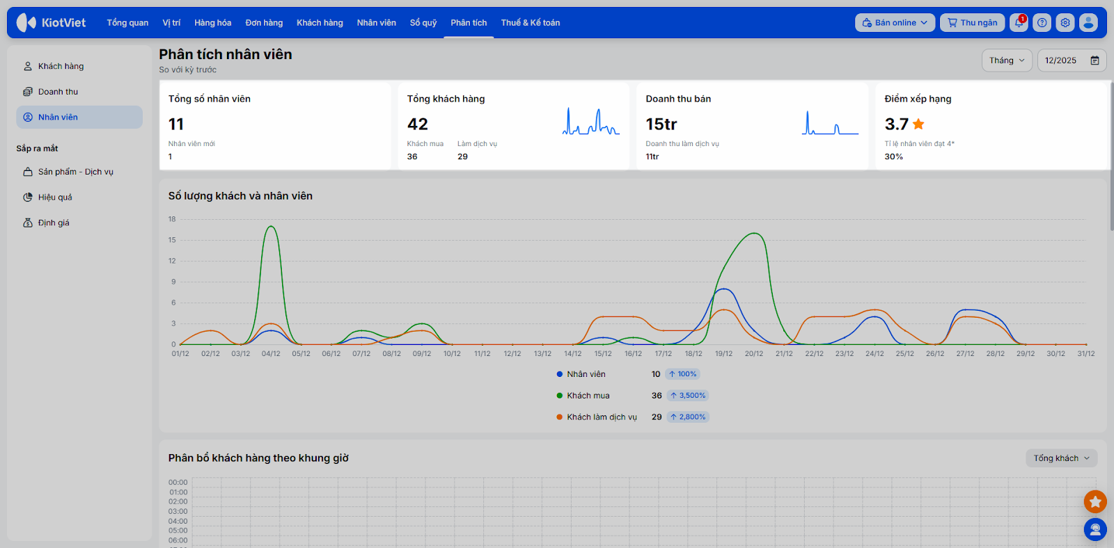 - Phân bổ khách hàng theo khung giờ: Giúp bạn so sánh lượng khách mua hàng và khách đang làm dịch vụ tại từng thời điểm, cụ thể:
