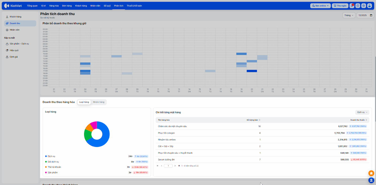 Tình huống thực tế: Vào những ngày cuối tuần, Salon thường rất đông khách nhưng doanh thu lại không tăng đột biến như kỳ vọng. Bạn cần tìm hiểu xem khung giờ nào đang quá tải để bổ sung nhân sự và liệu doanh thu đến từ việc bán gói dịch vụ hay bán lẻ mỹ phẩm.