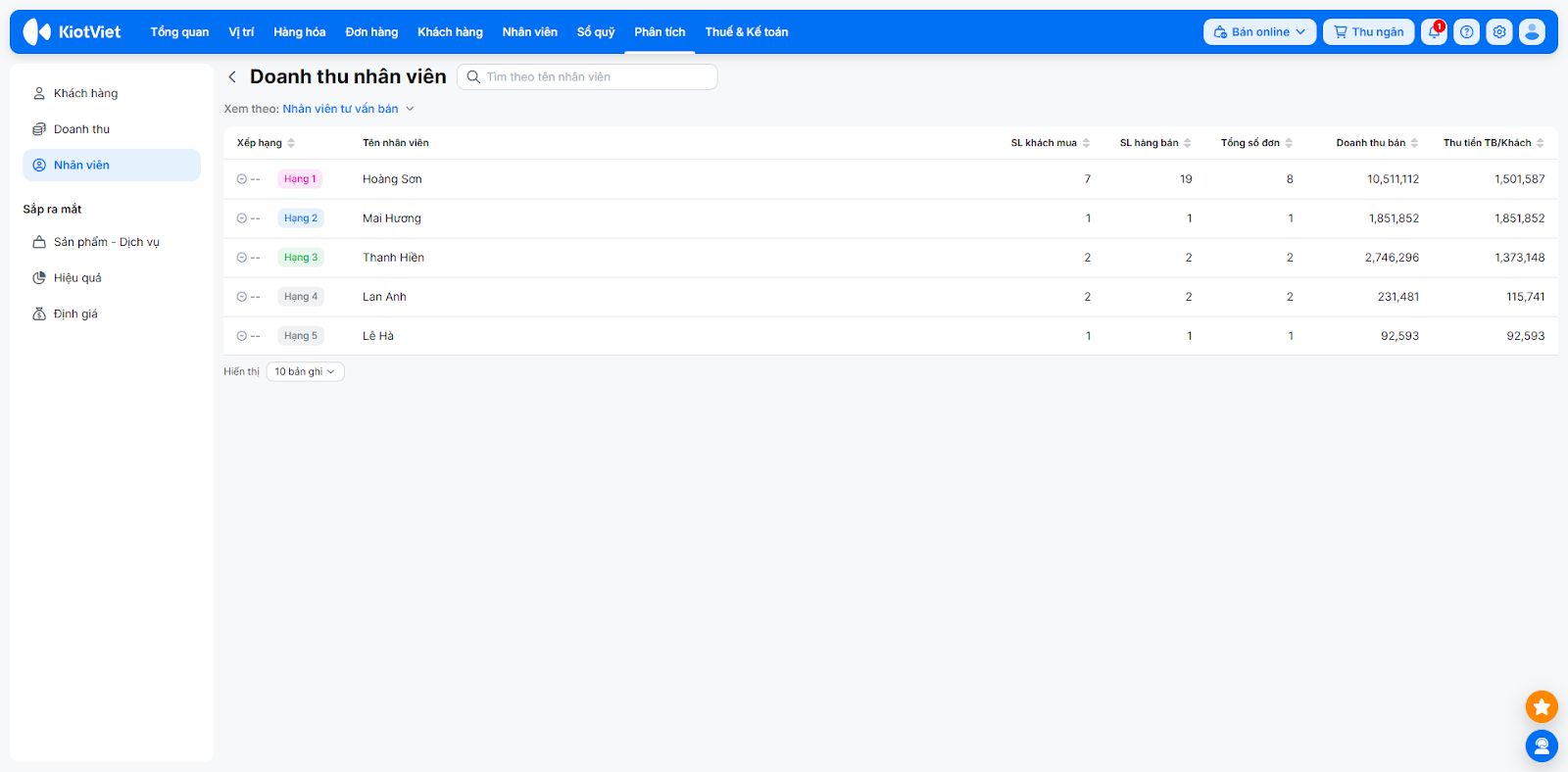 - Bạn có thể sắp xếp theo: Xếp hạng, Số lượng khách, Số lượng hàng bán, Tổng số đơn, Doanh thu bán, Thu tiền TB/khách.