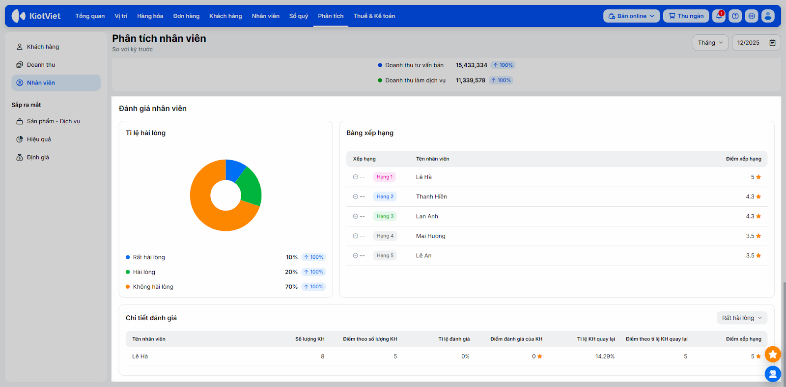 - Xếp hạng nhân viên = Dựa trên số lượng khách và doanh thu trung bình/khách (tỷ lệ 1:1).