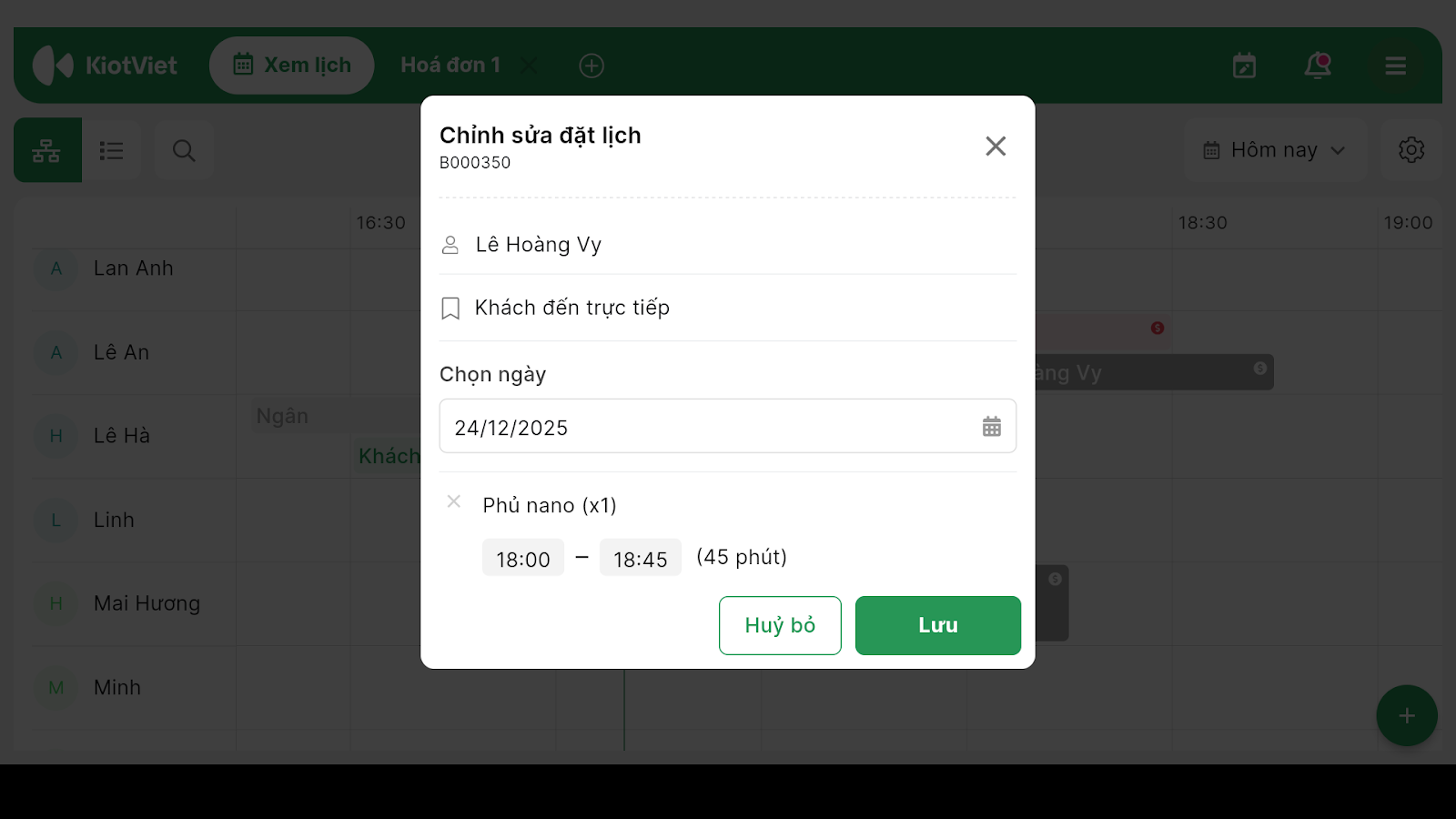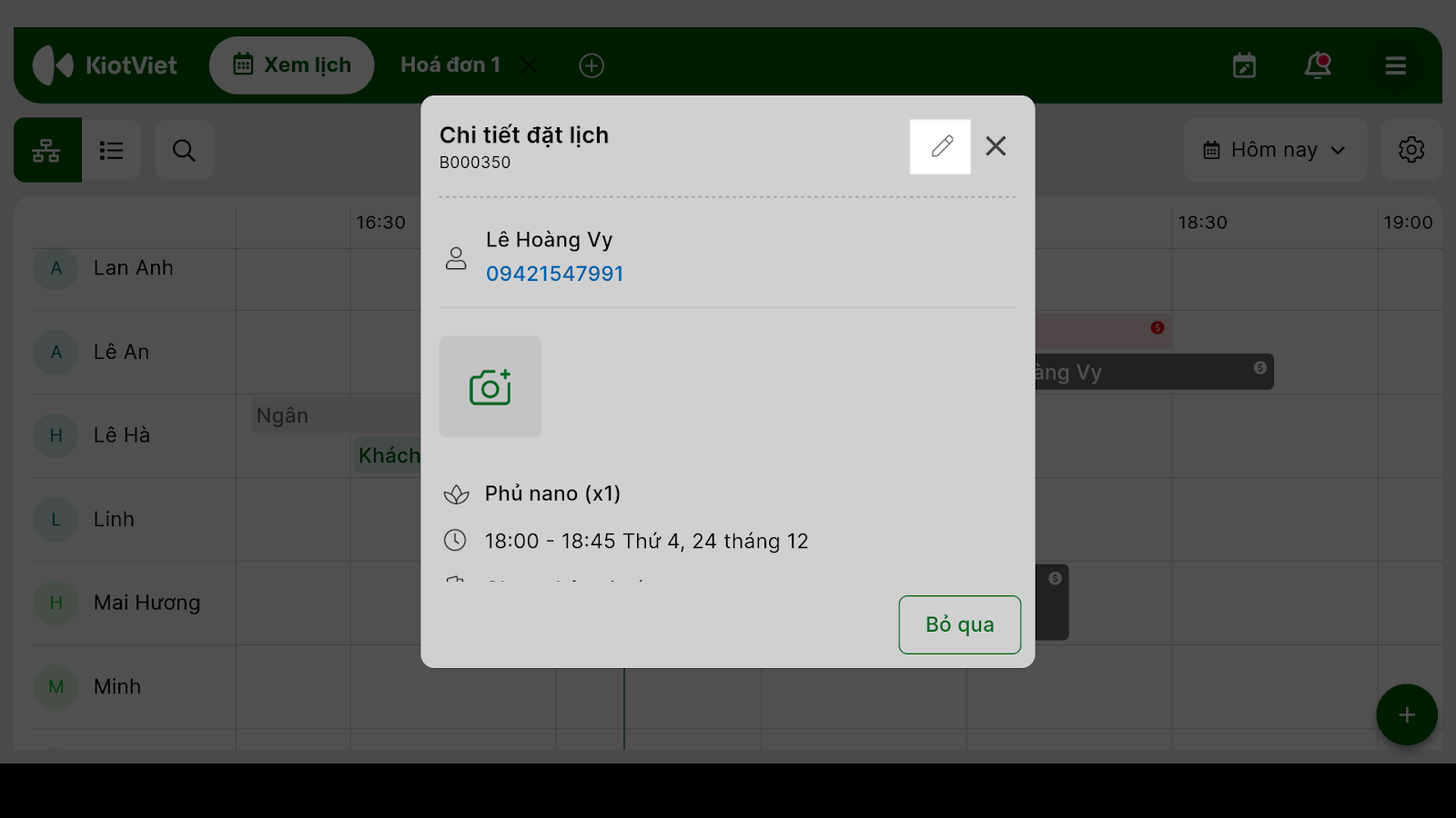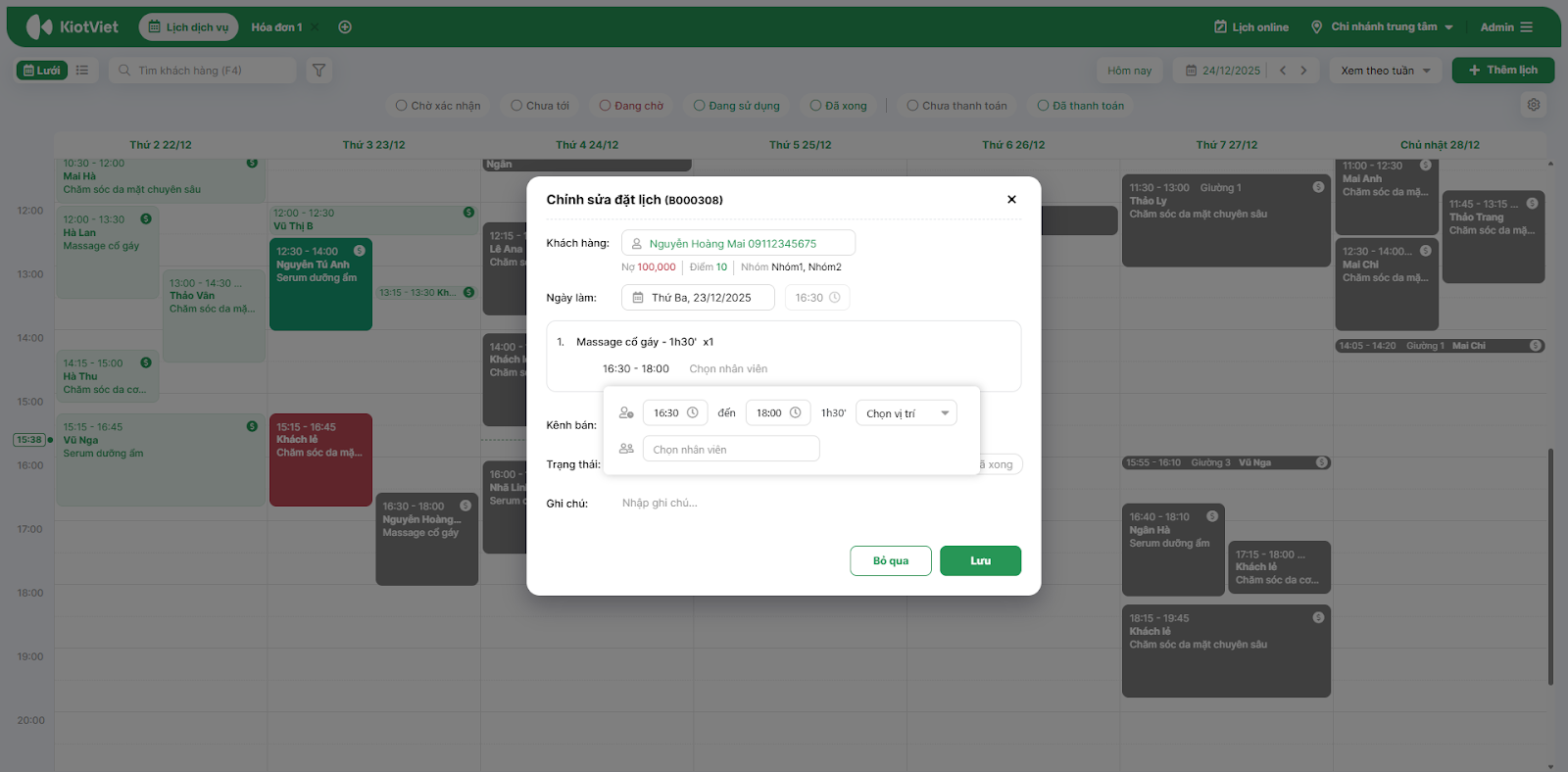 - Thay đổi các thông tin: Giờ hẹn, Nhân viên, Vị trí,…