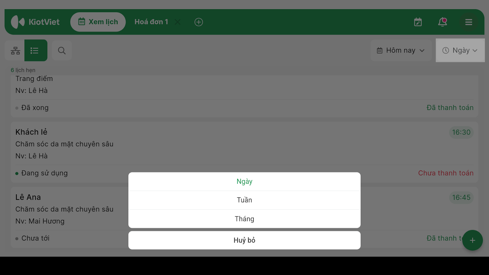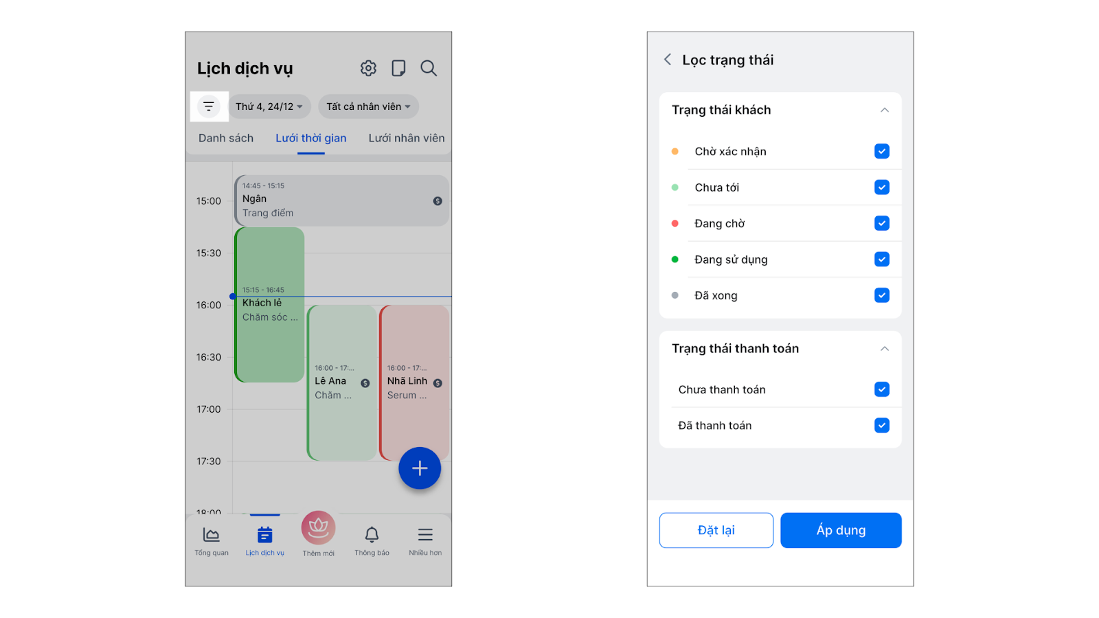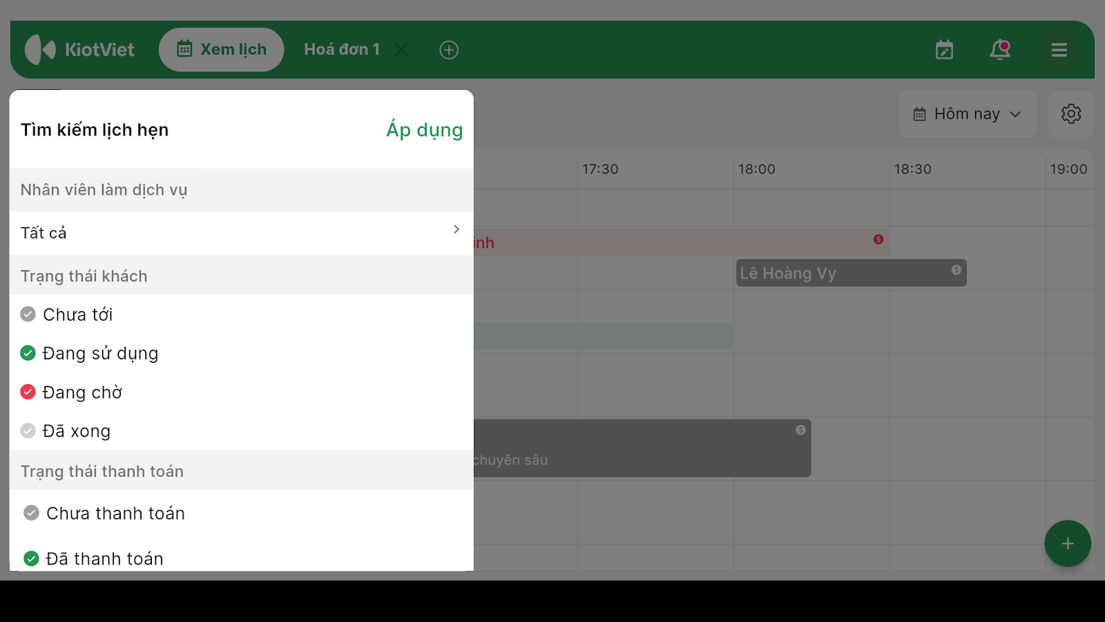 - Chạm vào biểu tượng kính lúp để lọc theo Nhân viên, Trạng thái khách hoặc Trạng thái thanh toán.