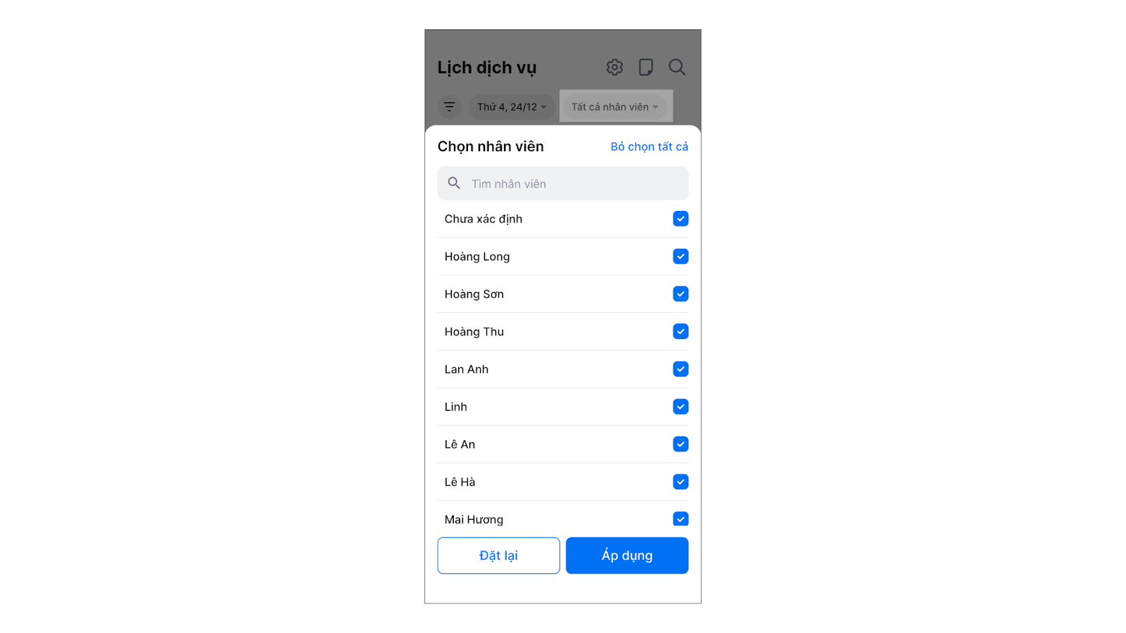 - Bộ lọc nhân viên: Chọn xem tất cả hoặc chỉ một vài nhân viên cụ thể.
