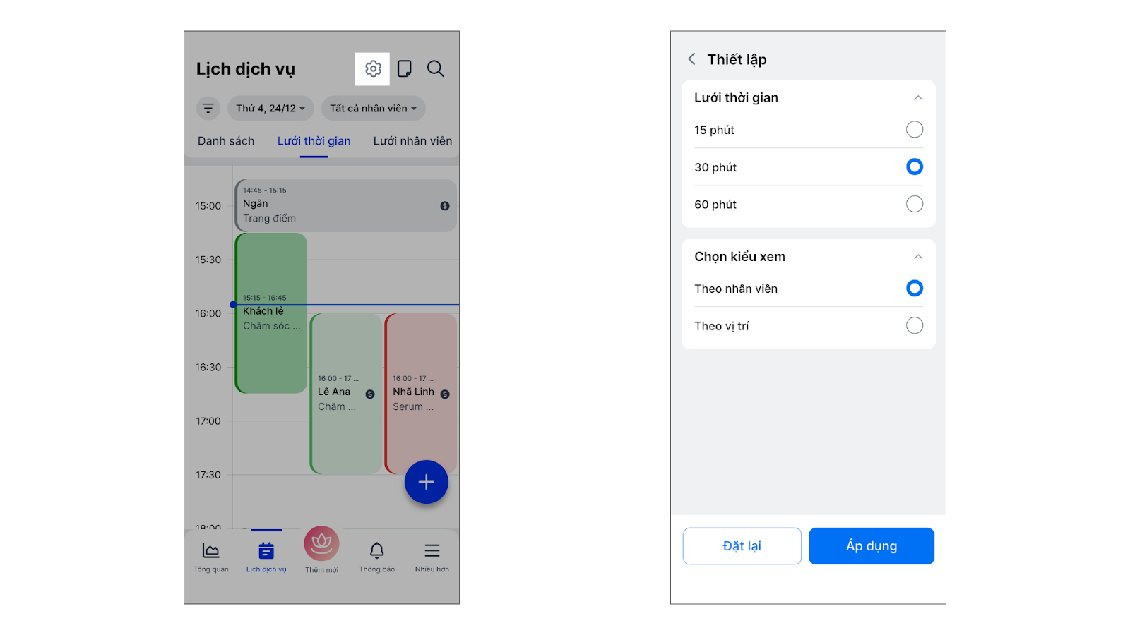 - Trên menu Lịch dịch vụ → kiểu hiển thị Lưới thời gian hoặc Lưới nhân viên → chạm vào biểu tượng Thiết lập (hình bánh răng).