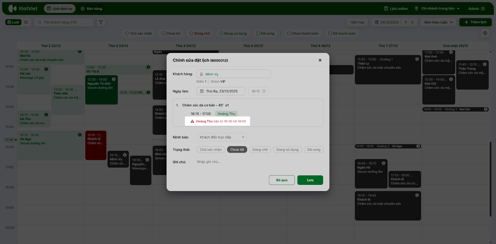- Lưu ý cảnh báo trùng: Để đảm bảo không có hai khách cùng đặt một vị trí hoặc một nhân viên vào cùng một giờ, hệ thống sẽ hiển thị cảnh báo trạng thái Bận nếu bạn cố tình xếp trùng. Bạn cần kiểm tra lại và chọn khung giờ hoặc nhân viên khác.