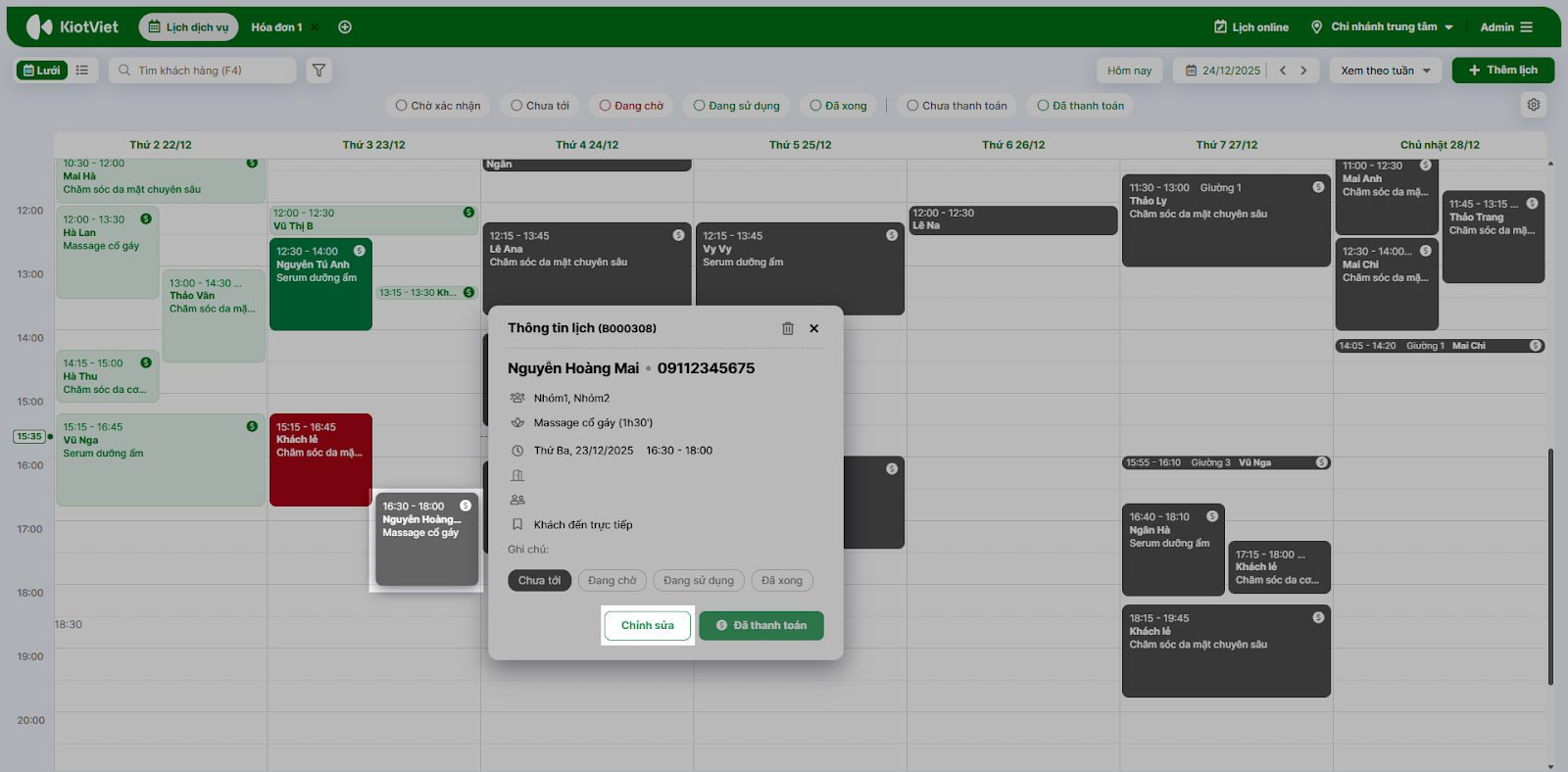 - Tình huống: Bạn cần sửa đổi thủ công thông tin chi tiết (như đổi dịch vụ, thêm ghi chú) thay vì chỉ đổi giờ. Đồng thời, bạn cần biết cách xử lý khi hệ thống báo nhân viên đã bận.