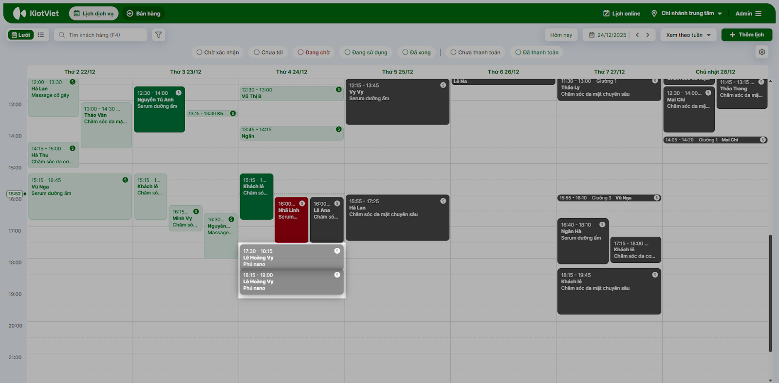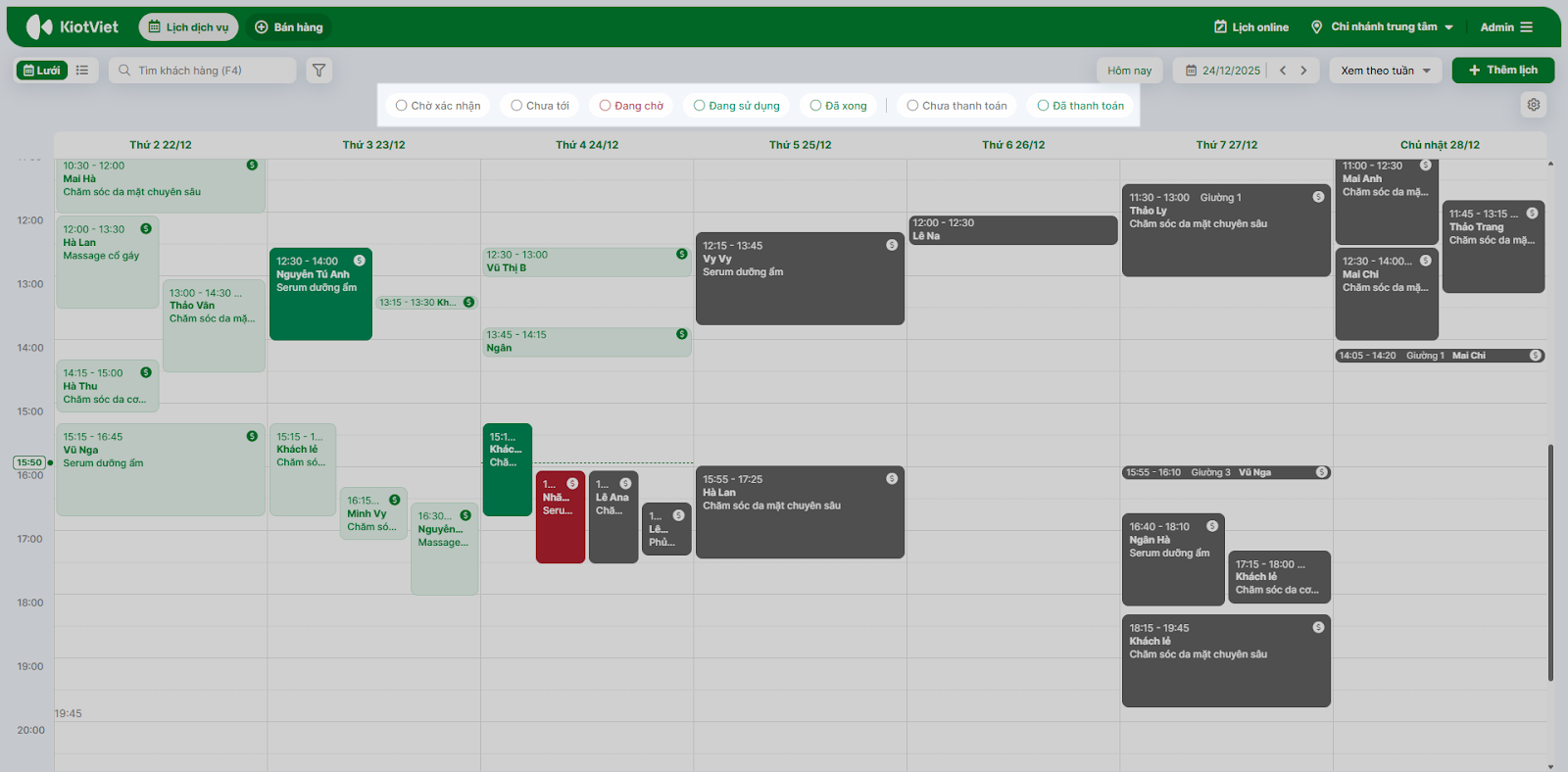 - Tình huống: Bạn là lễ tân spa và cần kiểm tra nhanh xem chiều nay còn phòng trị liệu nào trống hoặc kỹ thuật viên nào rảnh để nhận khách vãng lai.