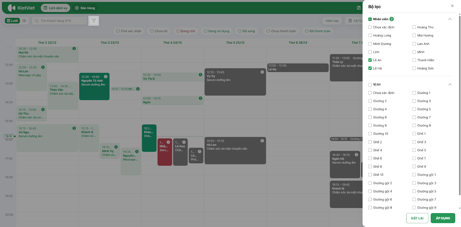 - Dạng Lưới: Kích biểu tượng Lịch để xem tổng quan các ô thời gian. Bạn có thể chọn xem theo Vị trí (Giường/Ghế) hoặc theo Nhân viên.