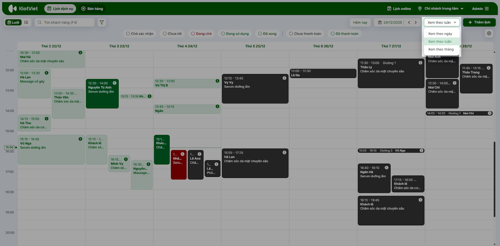 - Tại màn hình Thu ngân → Lịch dịch vụ, bạn lựa chọn chế độ hiển thị phù hợp: