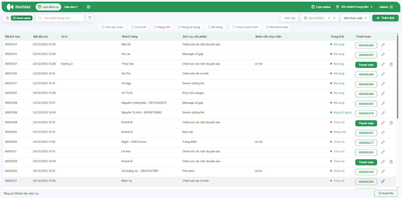 - Tình huống: Bạn cần lọc nhanh danh sách các lịch chưa thanh toán hoặc xem trạng thái khách.
