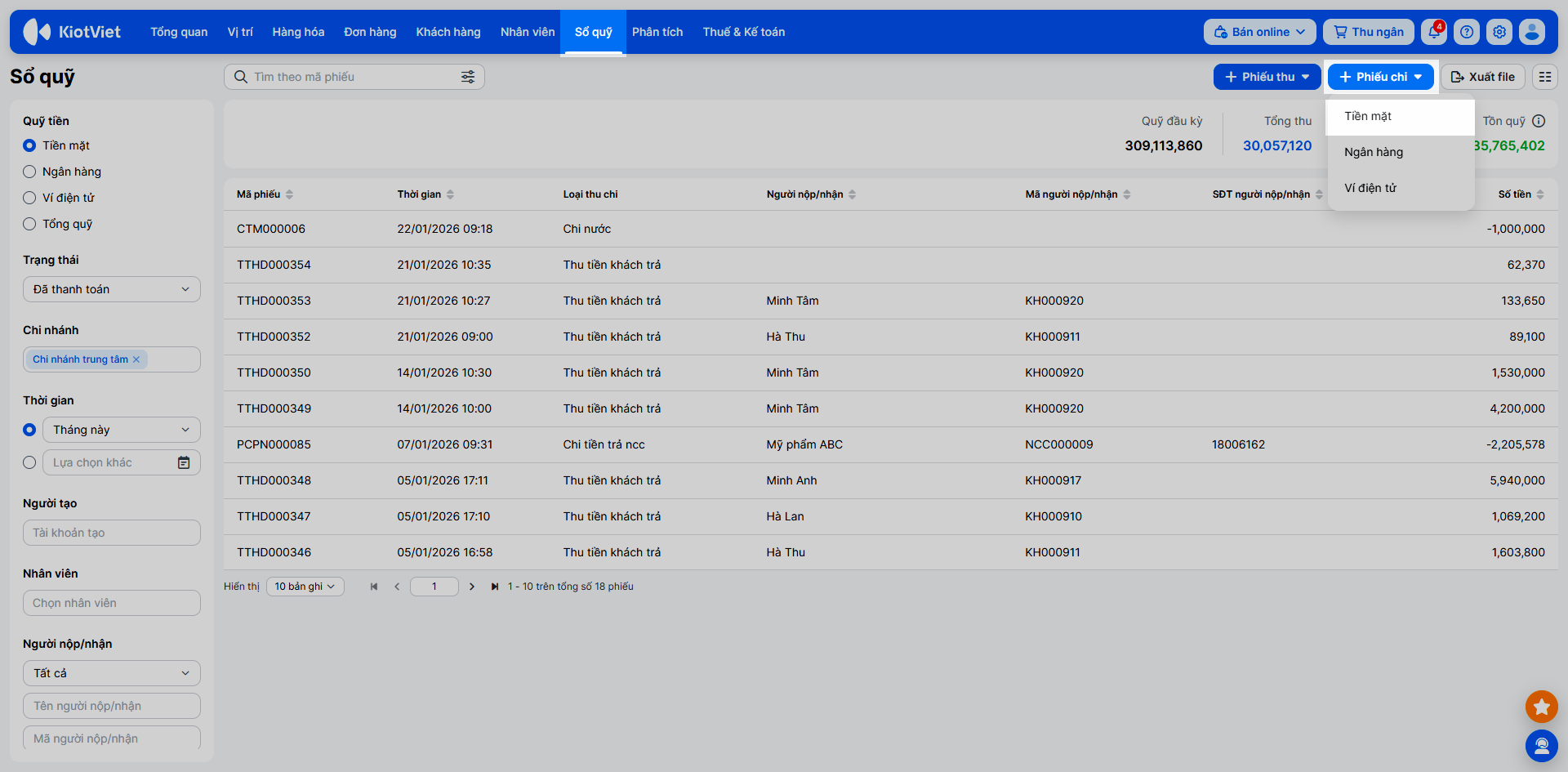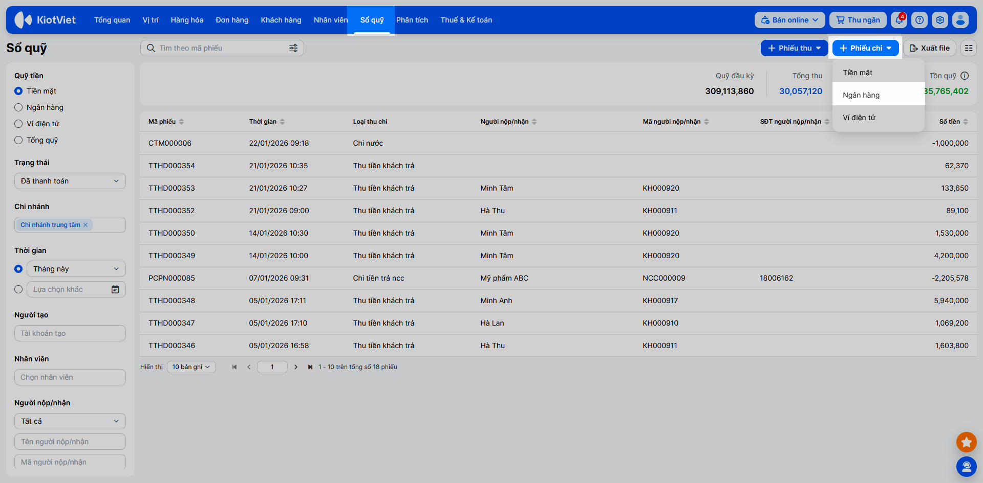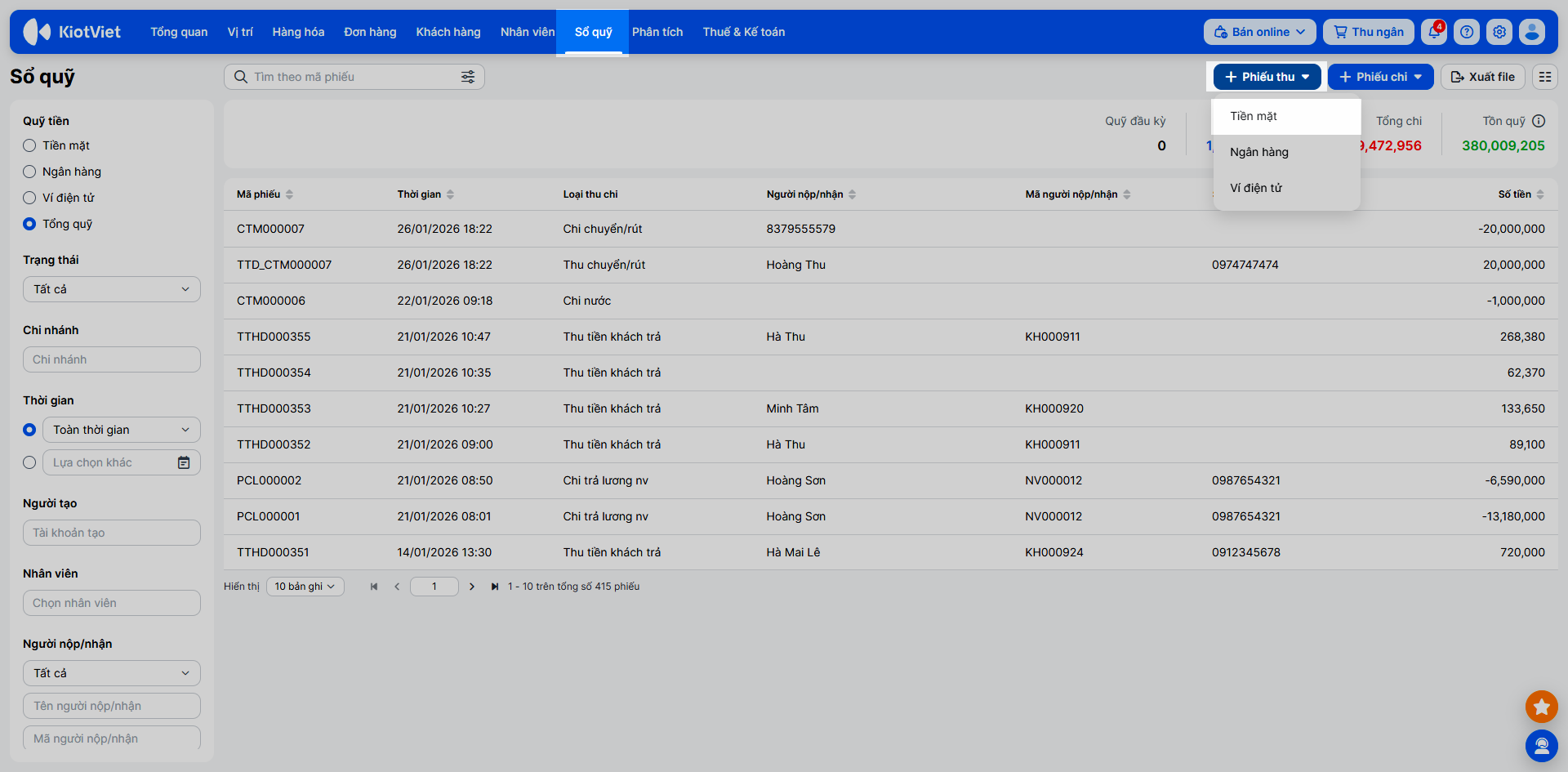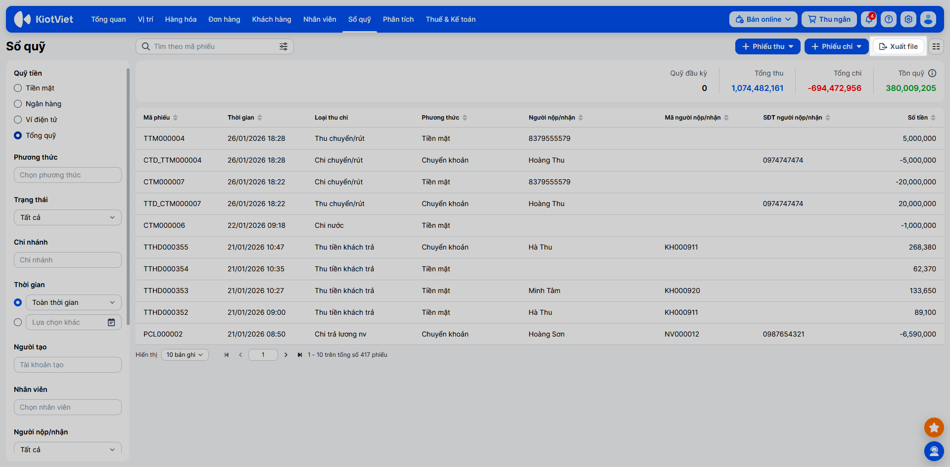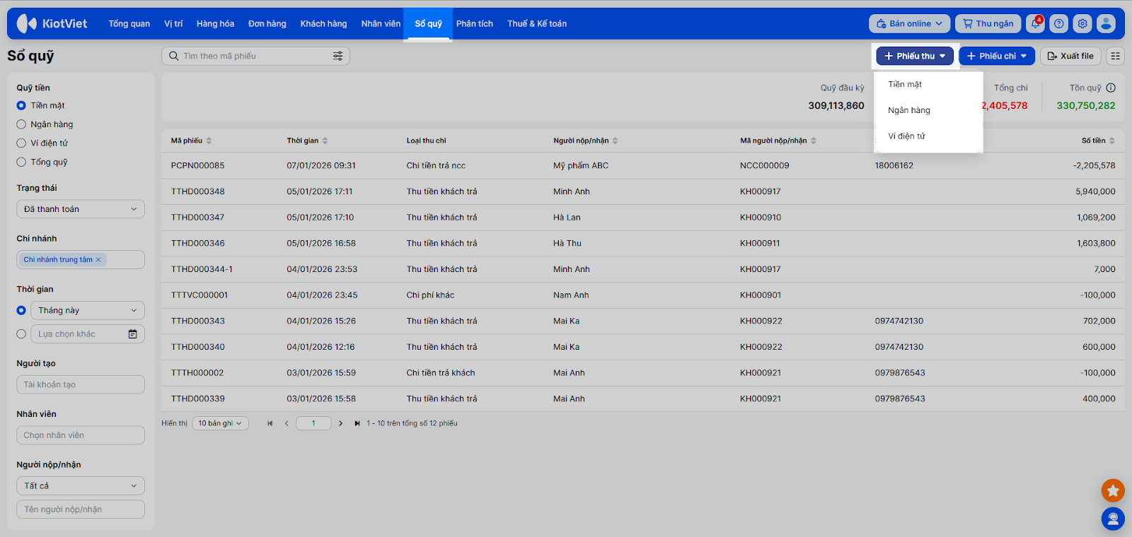 - Tìm kiếm: Sử dụng bộ lọc và ô tìm kiếm để tìm theo Mã phiếu, Loại thu chi, Trạng thái, Người nộp/nhận…