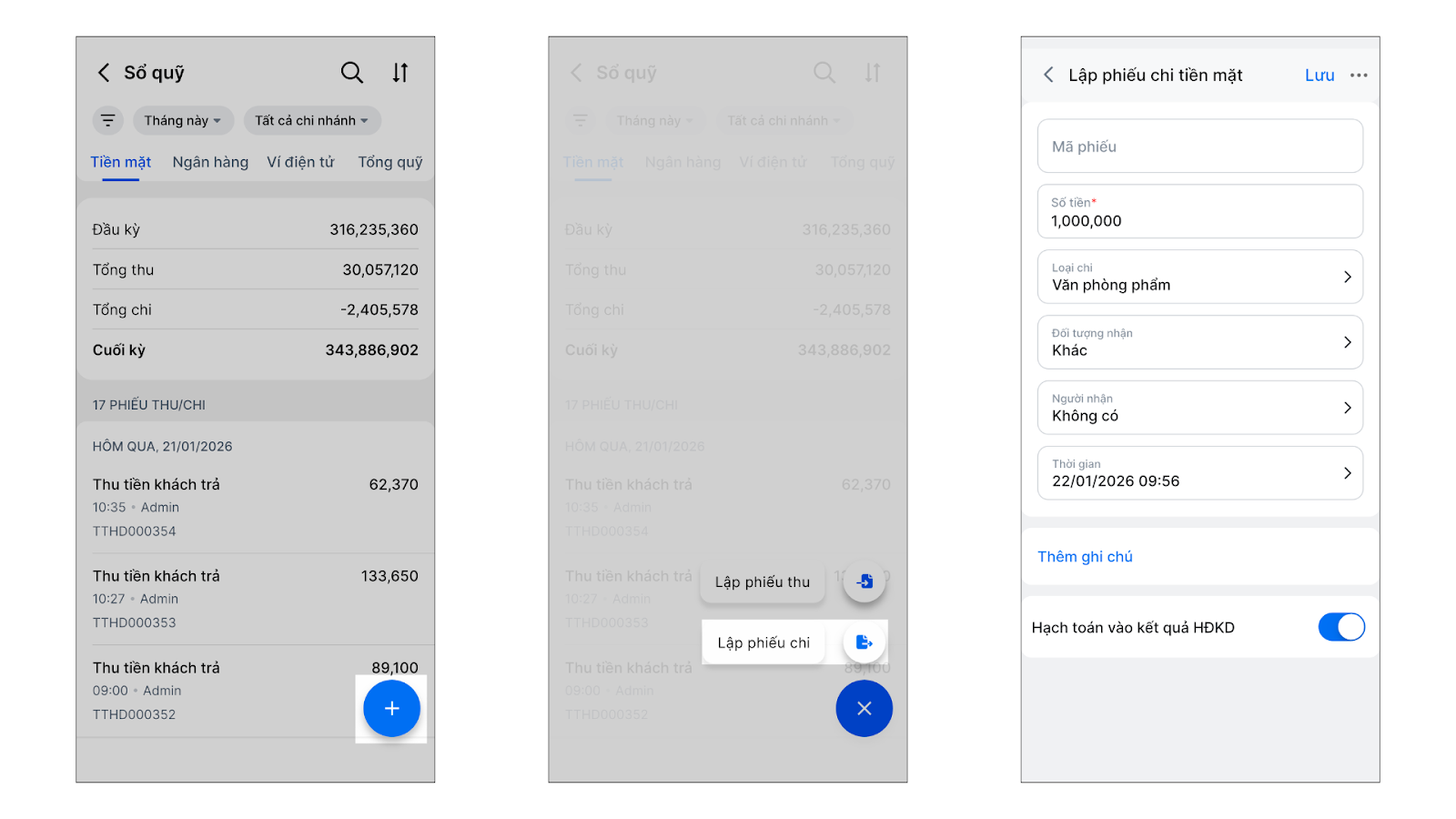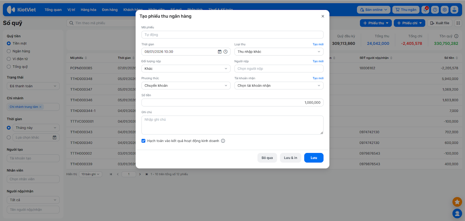 - Chọn Lập phiếu thu hoặc Lập phiếu chi.