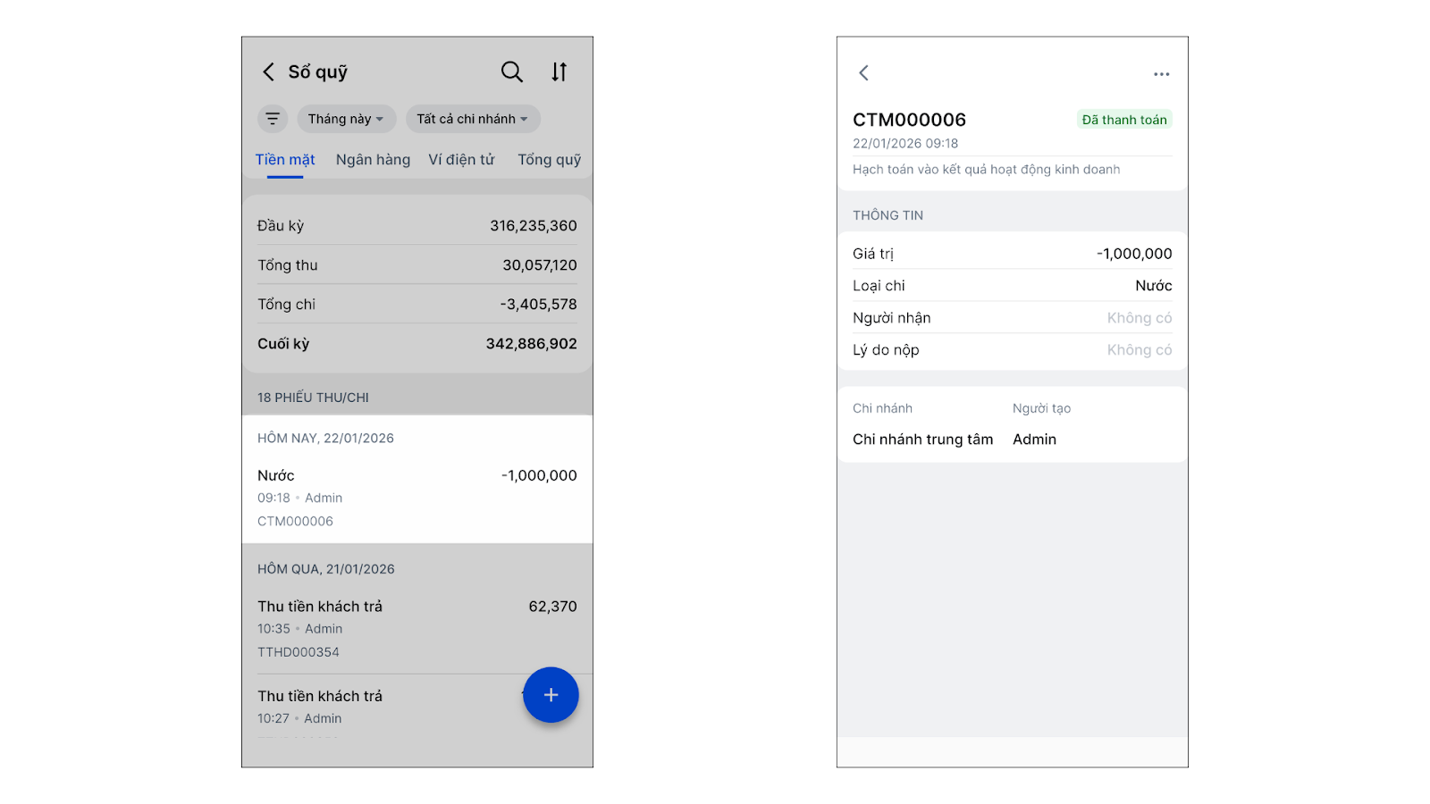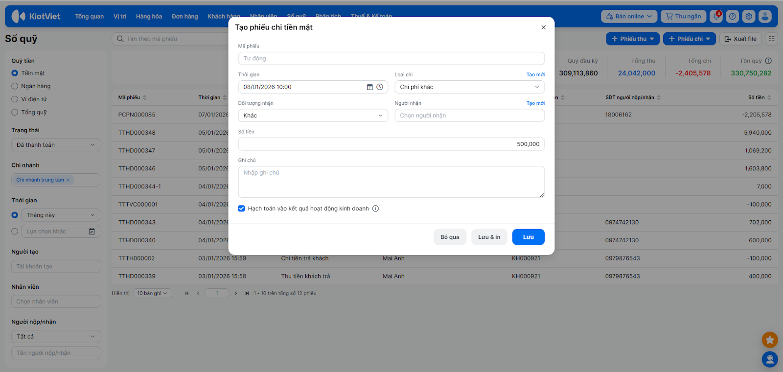 - Minh bạch tài chính: Theo dõi lịch sử người tạo phiếu, lý do thu/chi và hạch toán lãi lỗ chính xác.