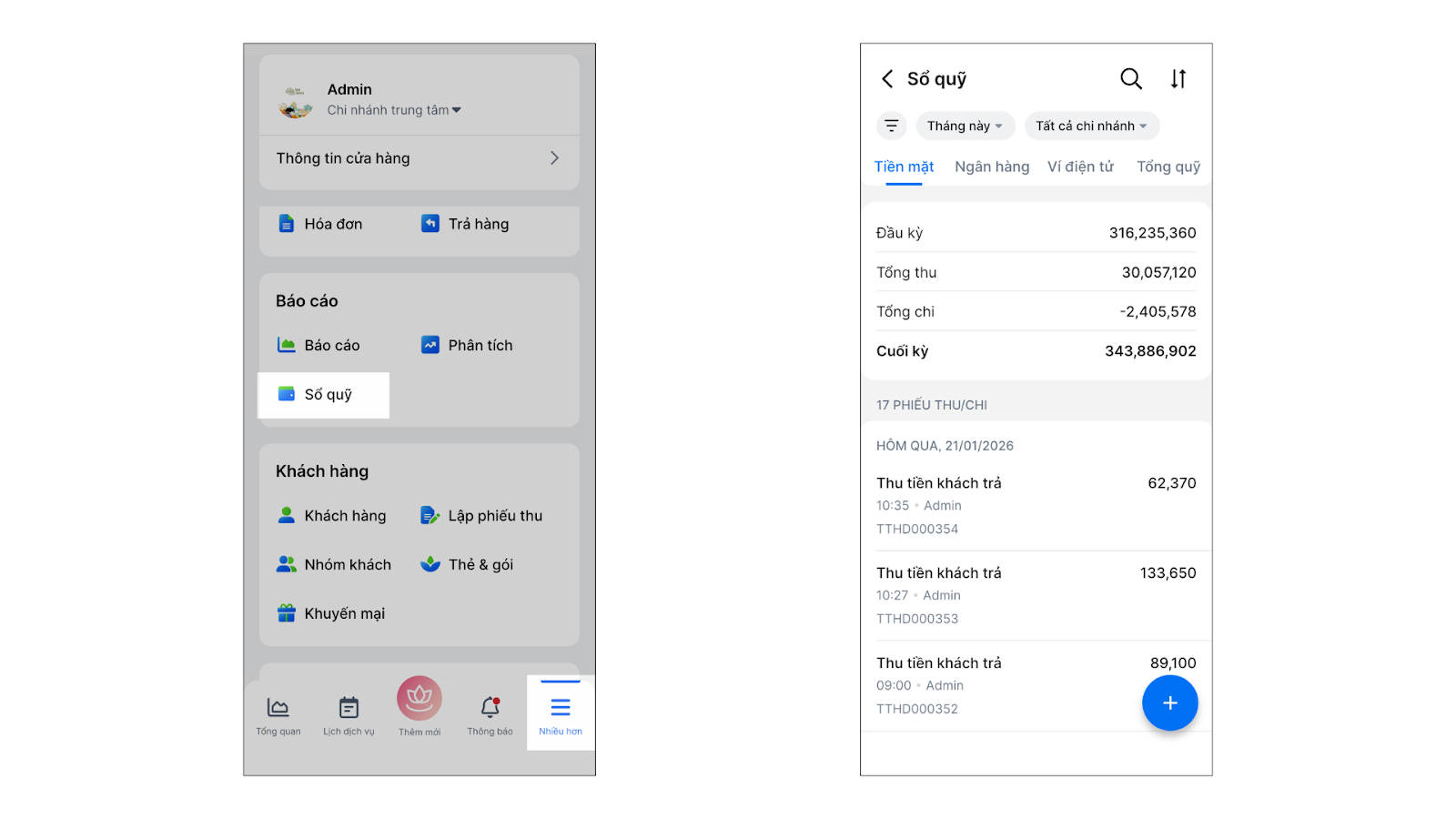 Trong kinh doanh Spa/Salon, ngoài doanh thu từ bán hàng và dịch vụ, cửa hàng thường xuyên phát sinh các khoản thu chi ngoài luồng. Tính năng Sổ quỹ giúp chủ cửa hàng quản lý chặt chẽ dòng tiền mặt và tiền gửi ngân hàng. Tổng quỹ = Tiền mặt + Ngân hàng.
