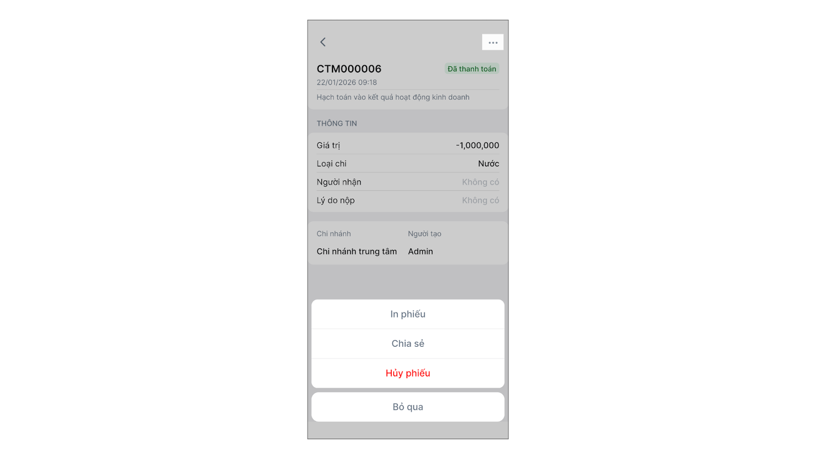 - Trong chi tiết phiếu thu/chi → chạm biểu tượng 3 chấm để thực hiện các thao tác: