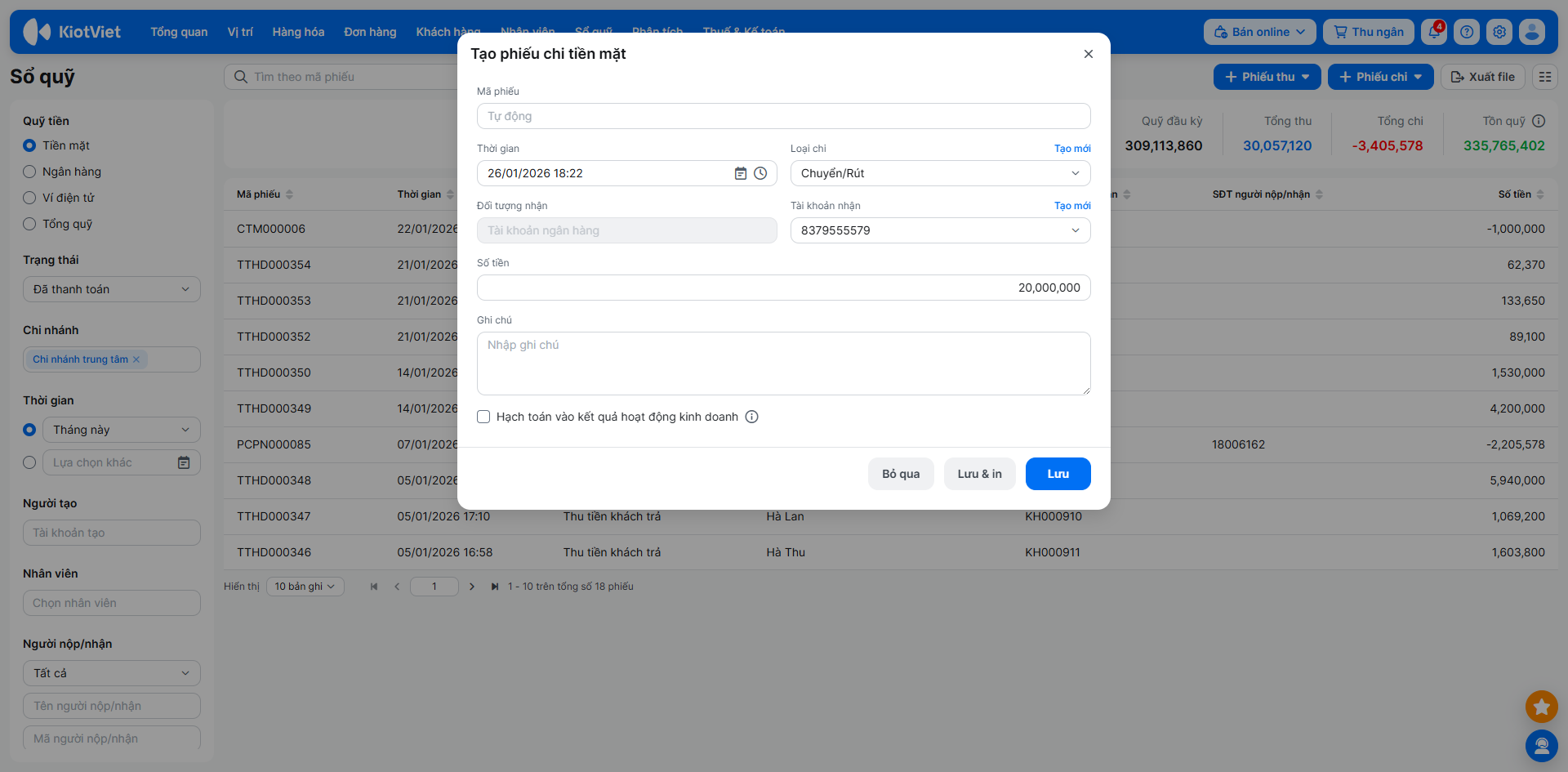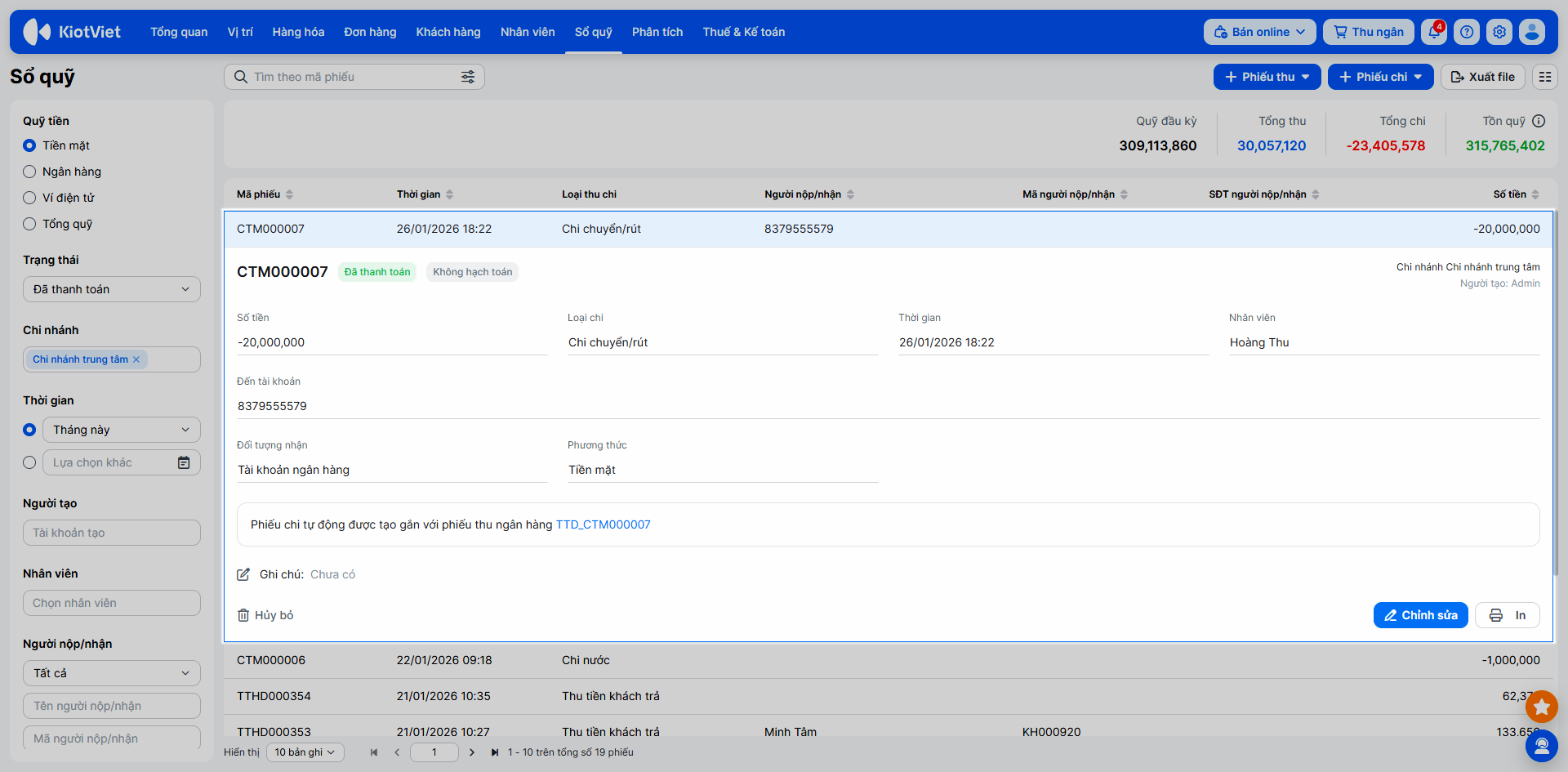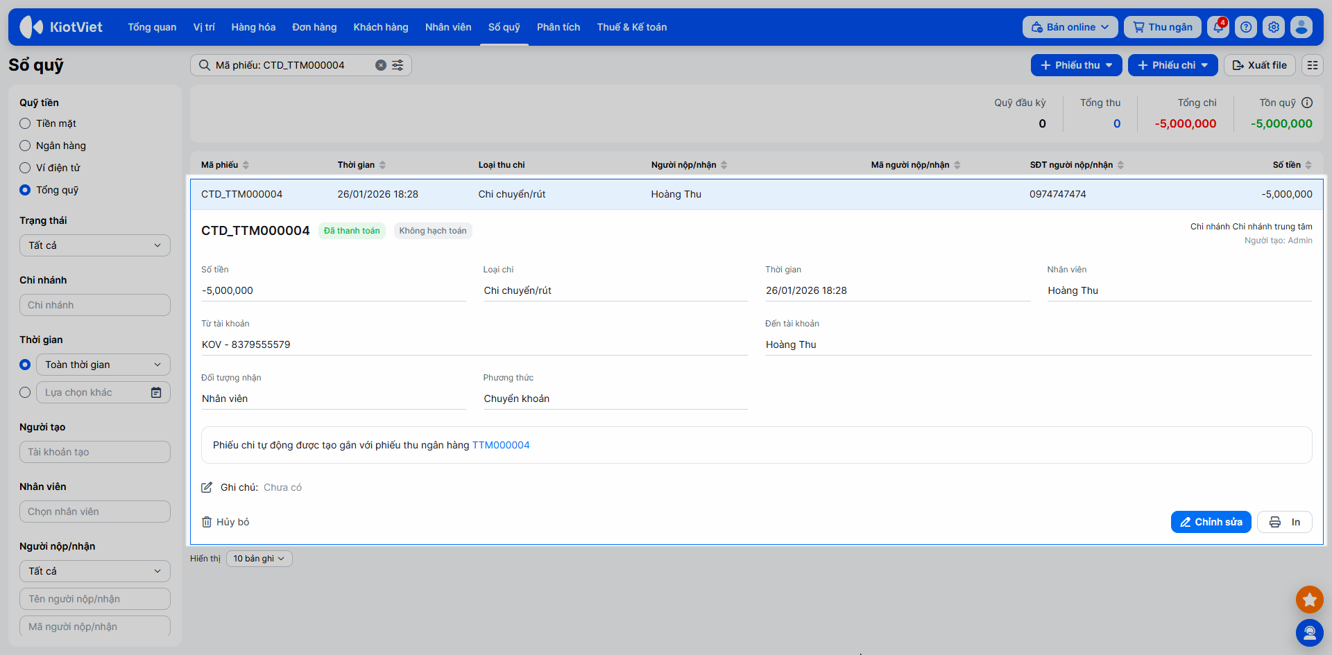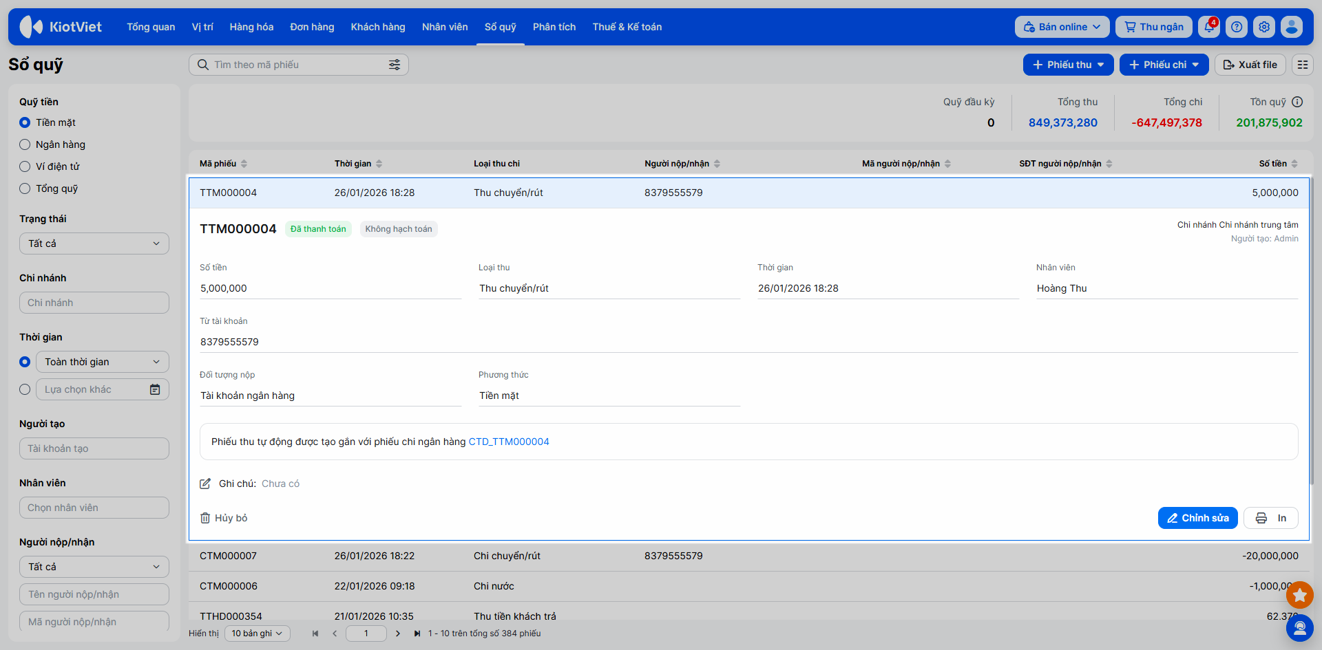 - Phiếu thu/chi loại chuyển/rút: Chỉ được sửa Thời gian, Giá trị, Ghi chú, Hạch toán.