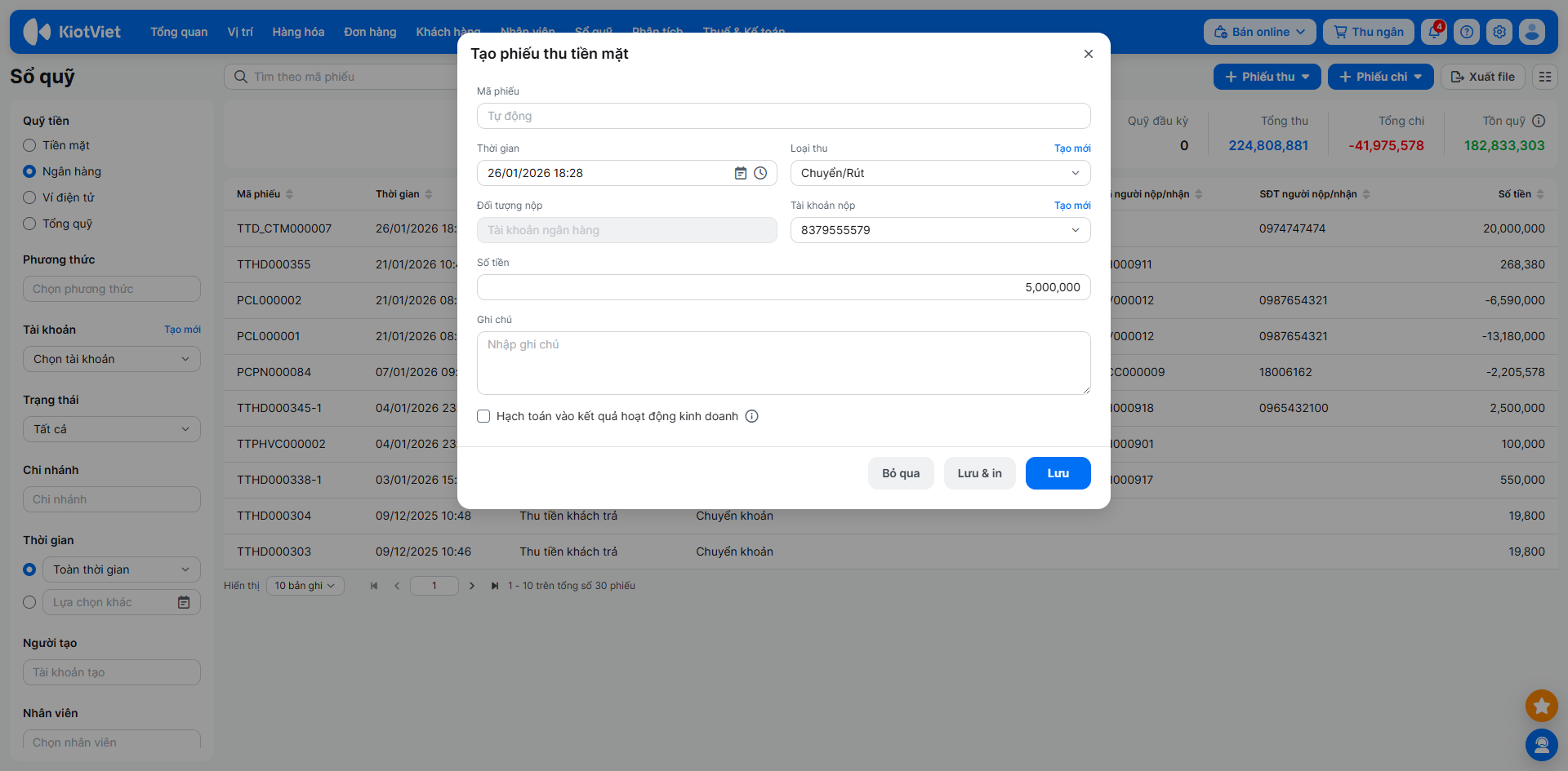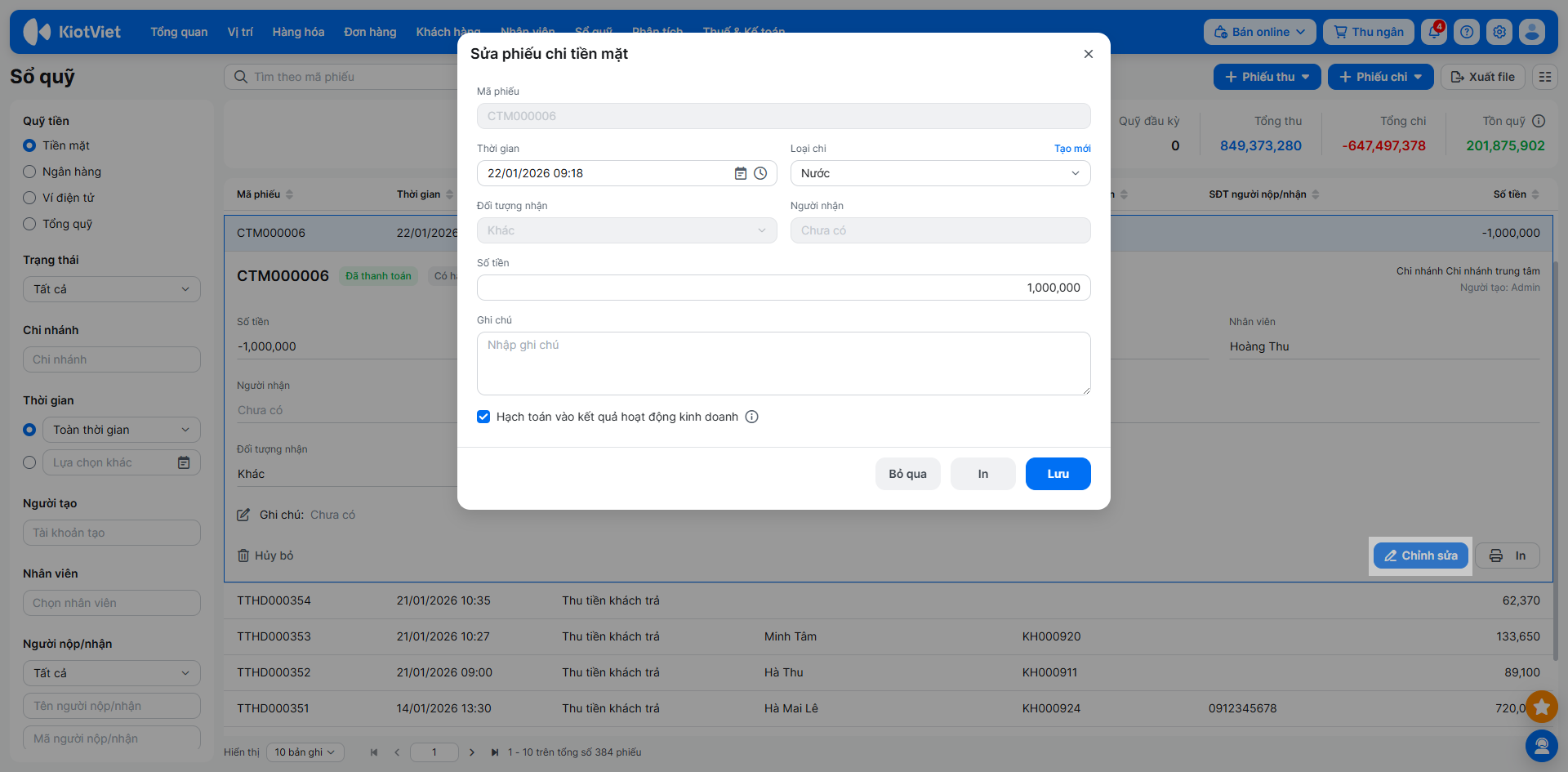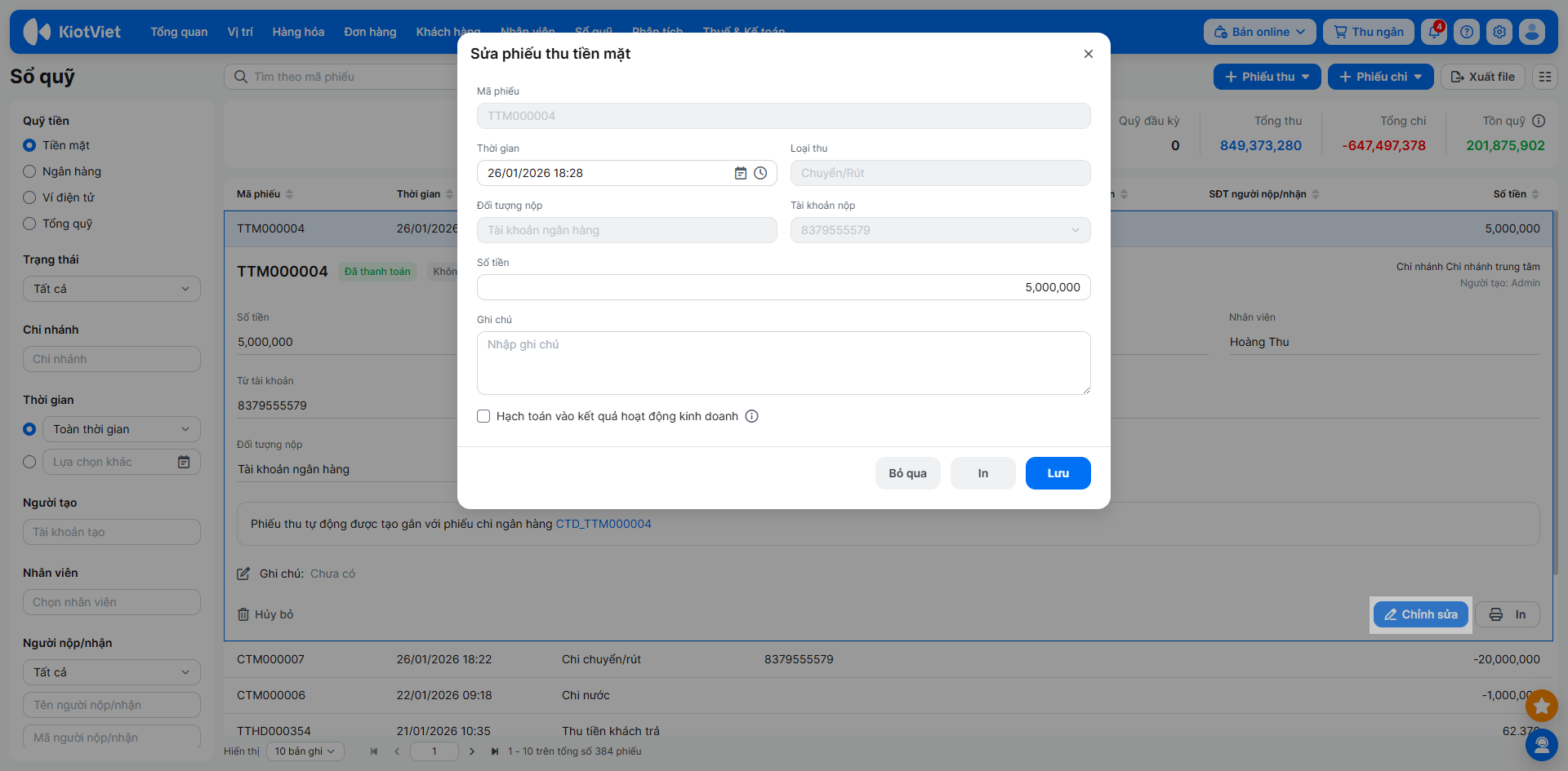 - Phiếu thu/chi được tạo thủ công trên Sổ quỹ (trừ loại chuyển/rút): Được sửa Thời gian, Loại thu/chi, Giá trị, Ghi chú, Hạch toán.