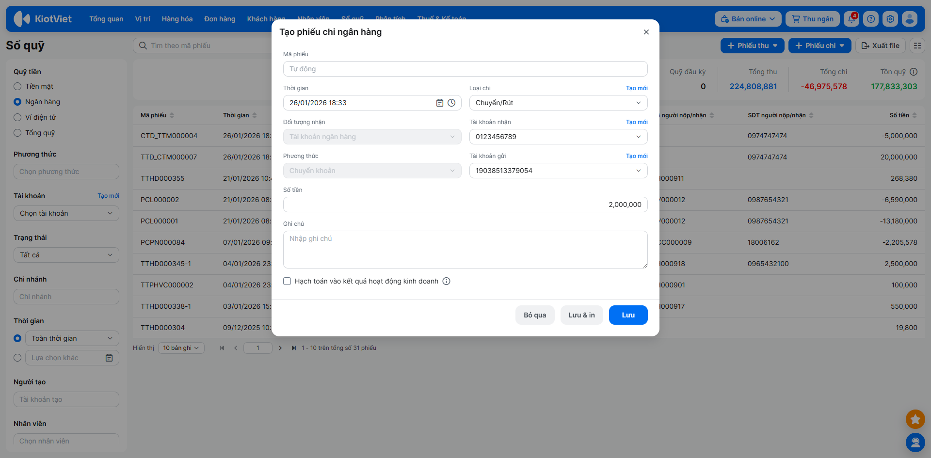 - Quản lý luân chuyển tiền: Hỗ trợ các nghiệp vụ nộp tiền doanh thu vào ngân hàng hoặc rút tiền về quỹ chi tiêu.