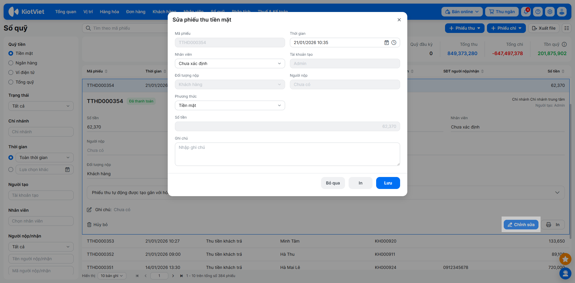 - Phiếu sinh tự động (từ Hóa đơn, Nhập hàng…): Chỉ được sửa Thời gian, Nhân viên, Phương thức, Ghi chú (Không sửa được Giá trị).