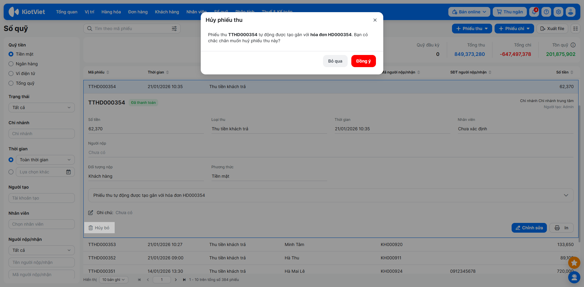 - Trên chi tiết phiếu thu/ chi → bạn nhấn Hủy bỏ → xác nhận Đồng ý hủy.