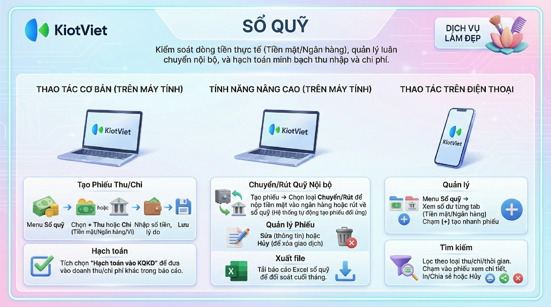 Ứng dụng KiotViet Salon hỗ trợ đầy đủ các thao tác với Sổ quỹ.