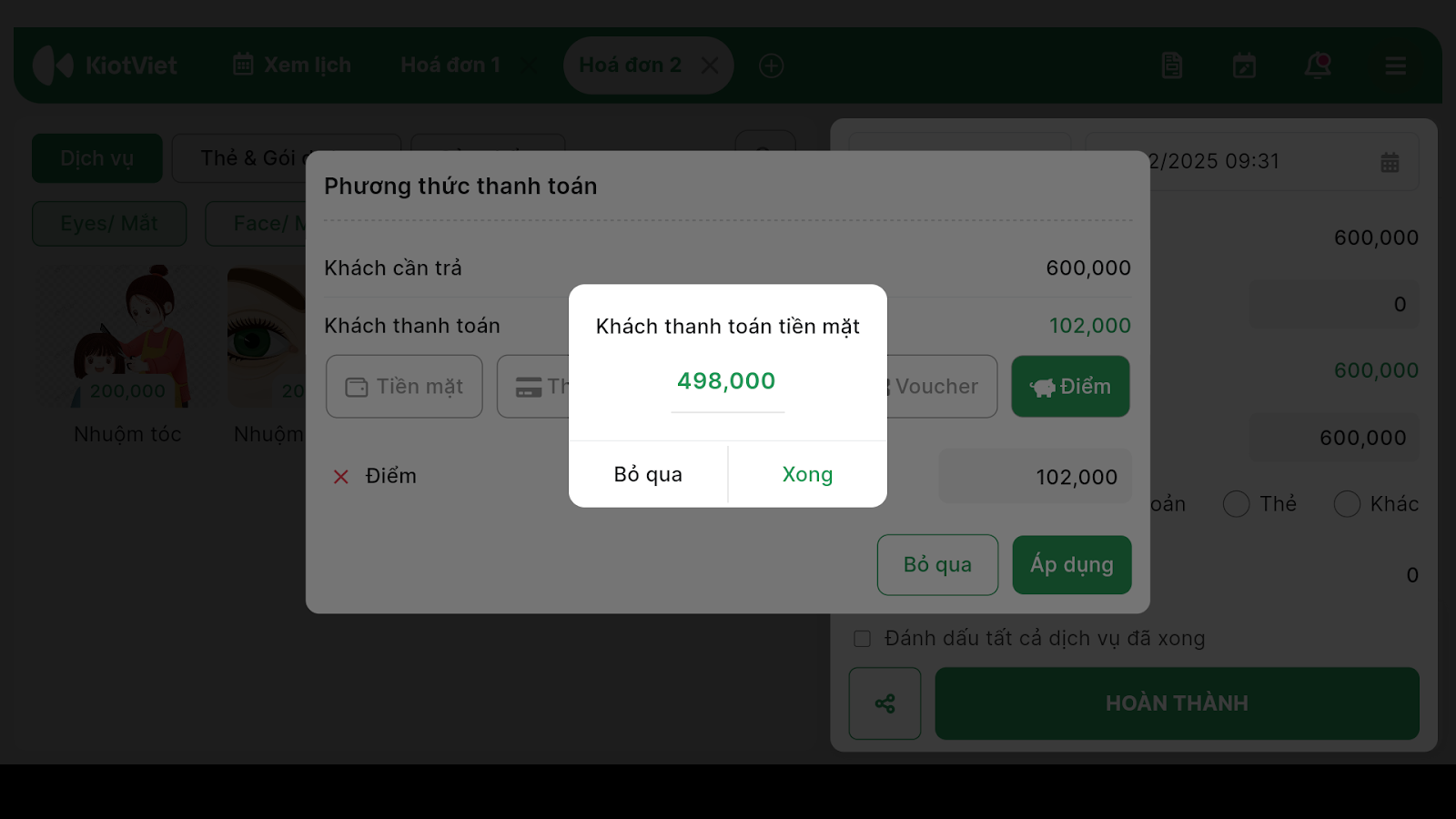 - Nhập số tiền tương ứng chọn Điểm (nếu khách có đủ điểm tích lũy).