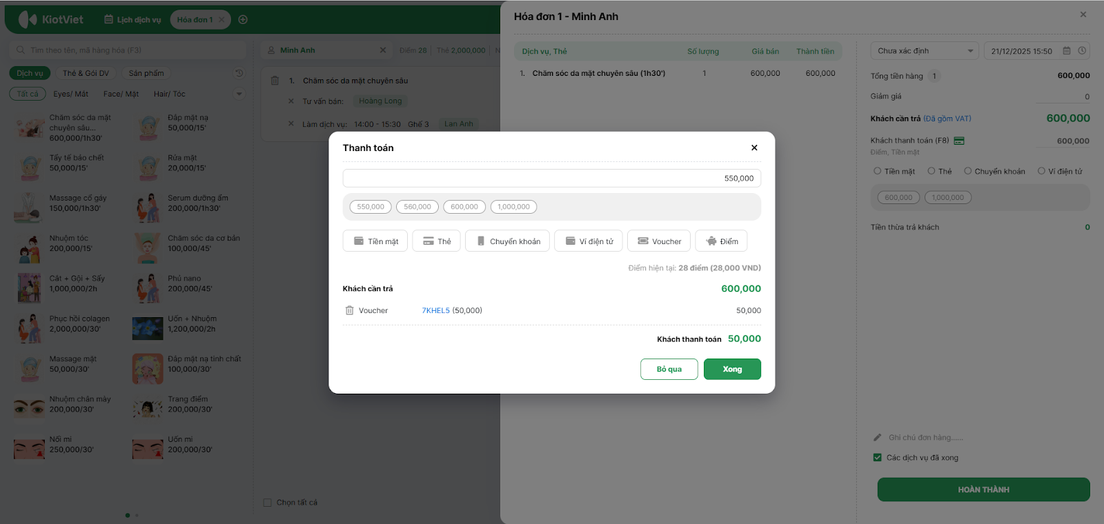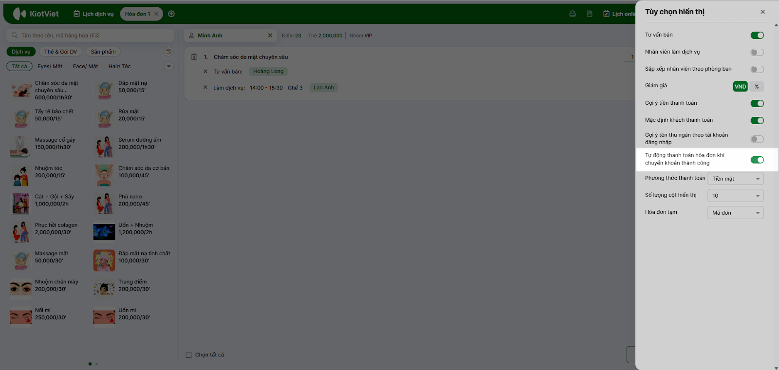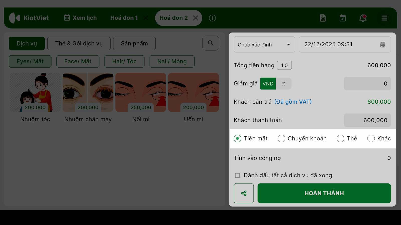 - Hệ thống chuyển sang tab Hóa đơn với đầy đủ dịch vụ khách đã làm.
