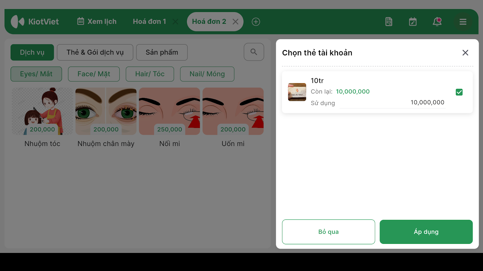 - Tại màn hình Tạo hóa đơn chọn Trừ thẻ tài khoản → tích chọn thẻ muốn sử dụng → nhấn Áp dụng.