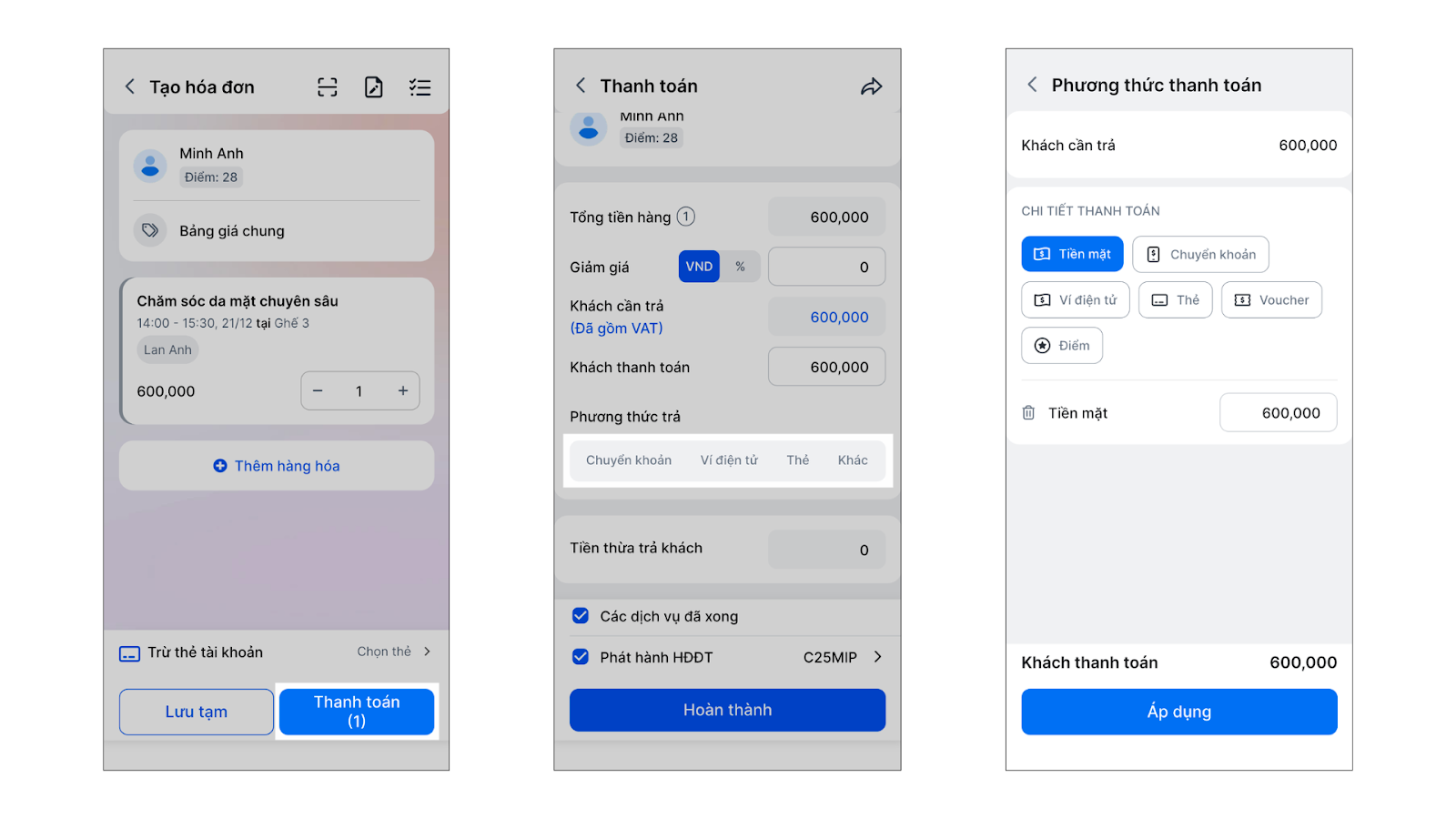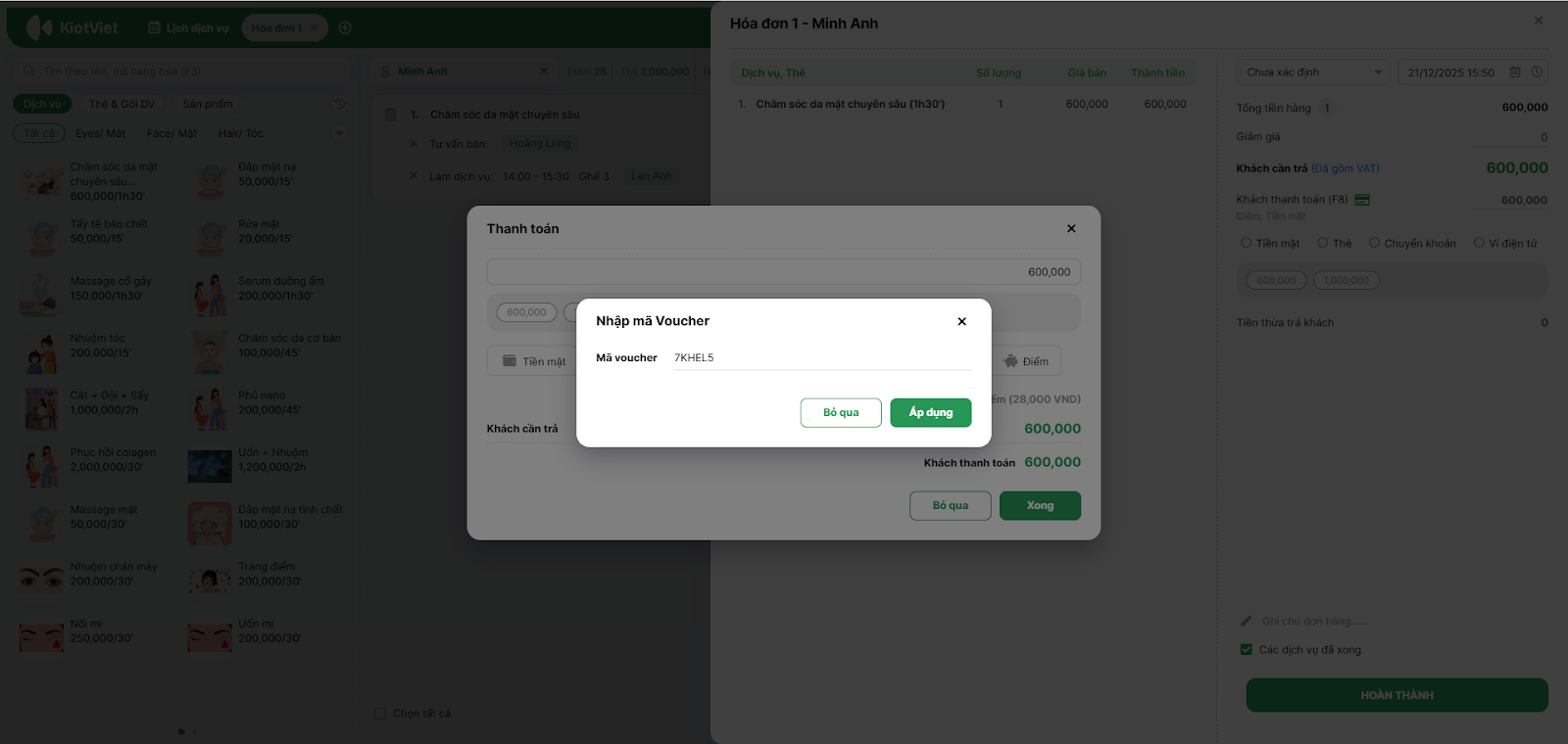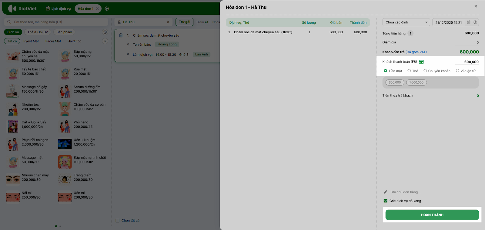- Tình huống: Khách thanh toán toàn bộ hóa đơn bằng một hình thức duy nhất (Ví dụ: 600,000đ Tiền mặt hoặc Chuyển khoản).