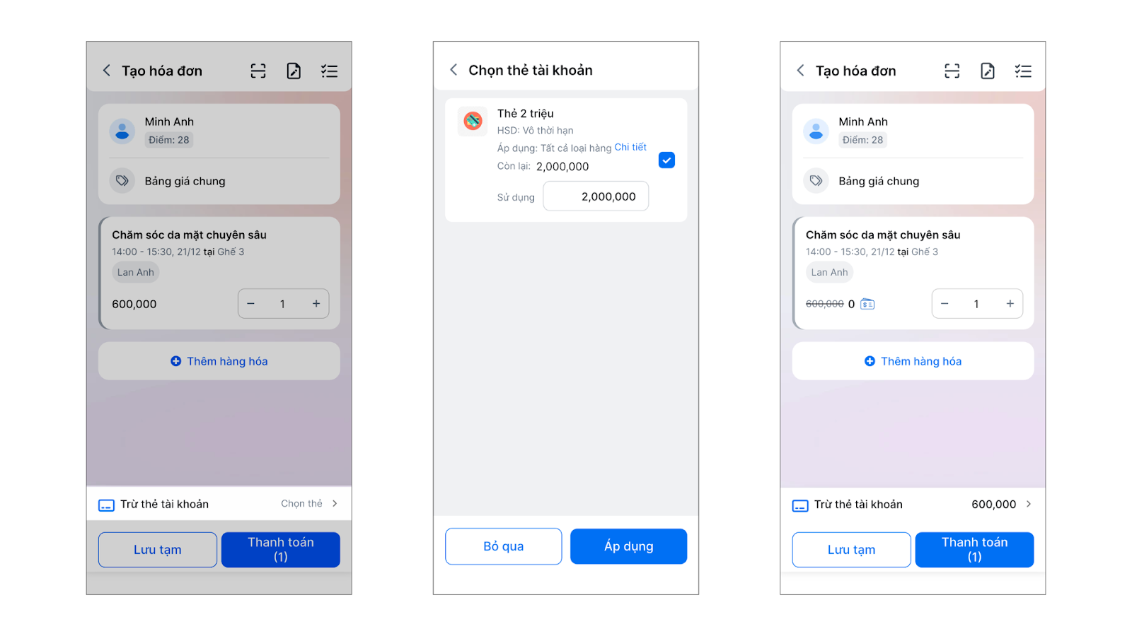 - Tích chọn thẻ → nhập số tiền muốn trừ (Mặc định trừ tối đa giá trị đơn hàng hoặc số dư thẻ).