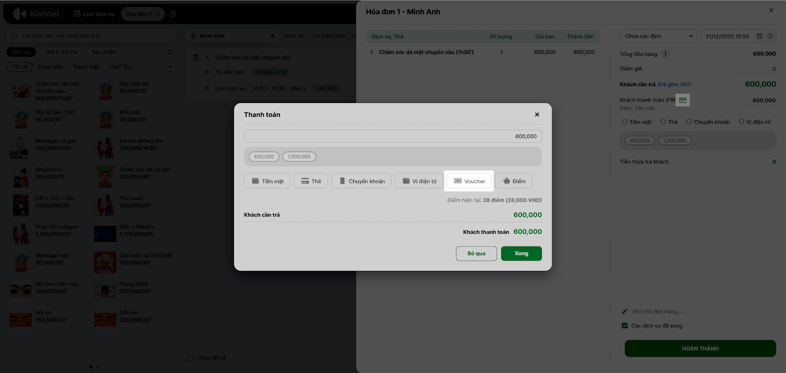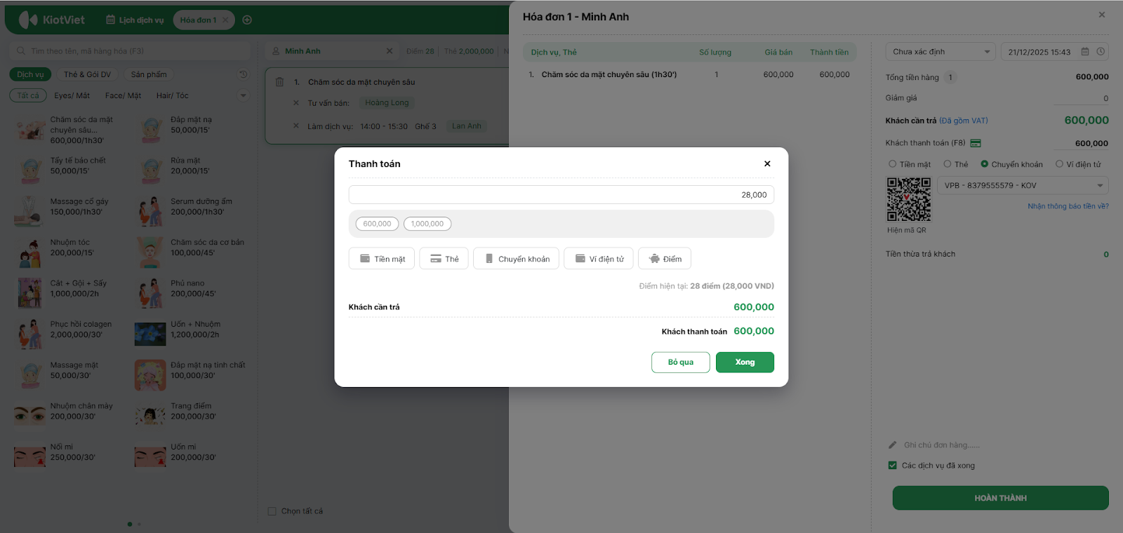 - Đa dạng phương thức, đáp ứng mọi nhu cầu: Hỗ trợ linh hoạt thanh toán qua nhiều hình thức phổ biến: Tiền mặt, Thẻ ngân hàng, VietQR, Trừ Thẻ tài khoản (Thẻ liệu trình), Điểm tích lũy, Voucher.