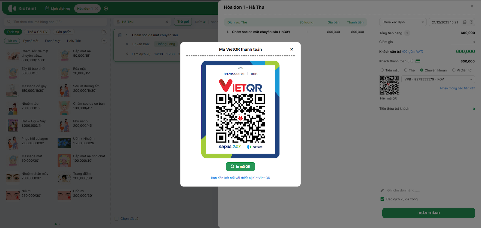 - Khi khách quét mã VietQR và tiền về, hóa đơn sẽ tự động được đóng và in ra (nếu bật tự động in).