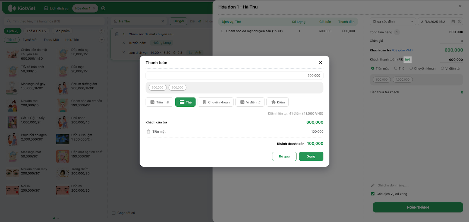 - Tình huống: Khách hàng chăm sóc da hết 600,000đ. Khách muốn trả 100,000đ bằng Tiền mặt, phần còn lại quẹt Thẻ tín dụng.