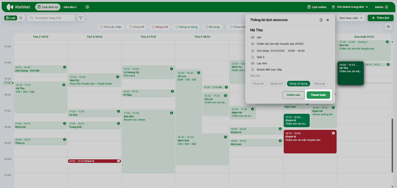 - Tại màn hình Thu ngân → Lịch dịch vụ, kích vào ô lịch của khách → chọn Thanh toán.
