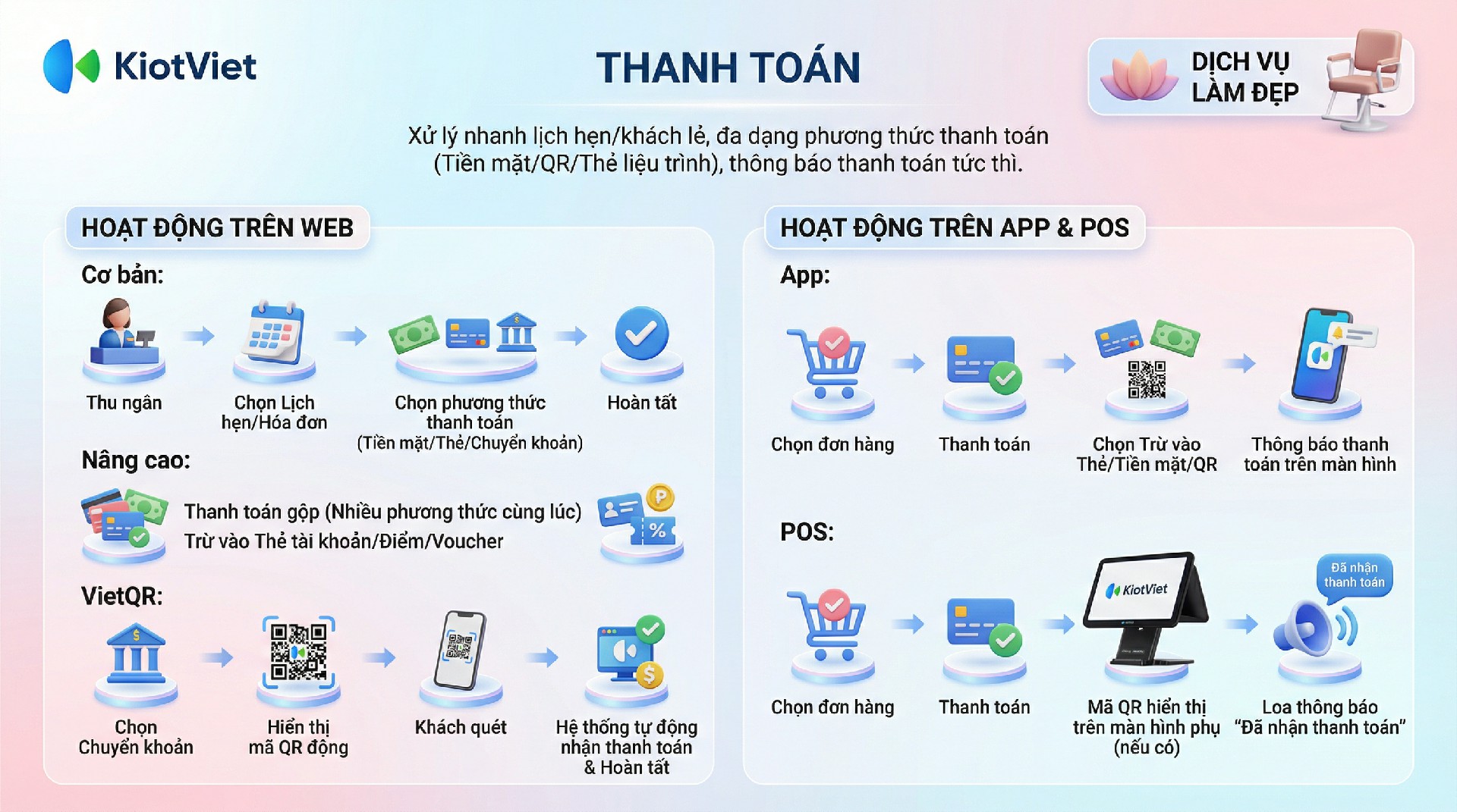 Tính năng Thanh toán là nghiệp vụ quan trọng giúp hoàn tất giao dịch tại Salon, Spa, Nail mi một cách nhanh chóng, chính xác và chuyên nghiệp trên mọi nền tảng của KiotViet.