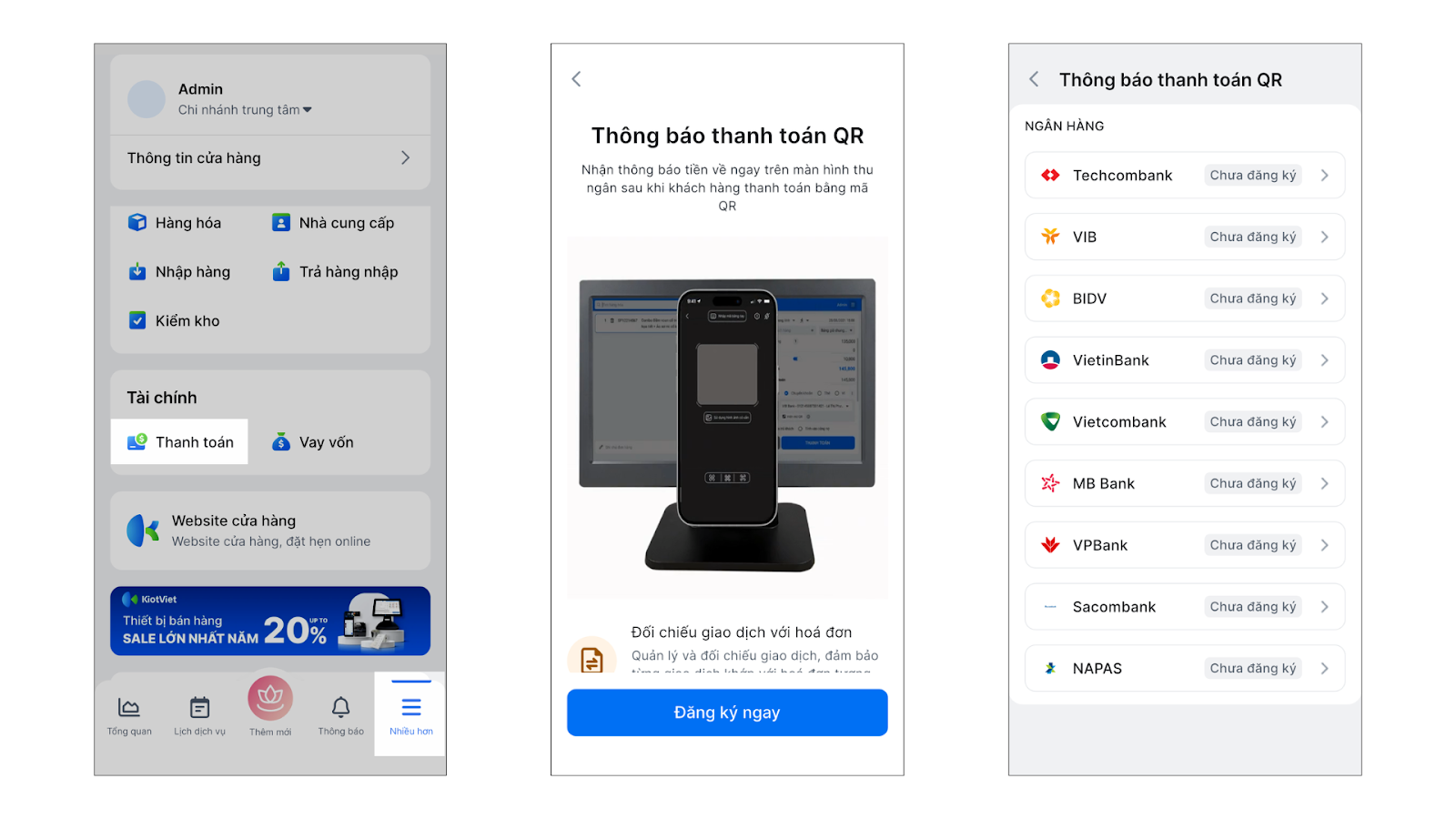 - Chức năng nâng cao: Tự động gửi thông báo giao dịch thành công (“Tiền về”) ngay trên phần mềm, được KiotViet hợp tác triển khai với các ngân hàng đối tác.