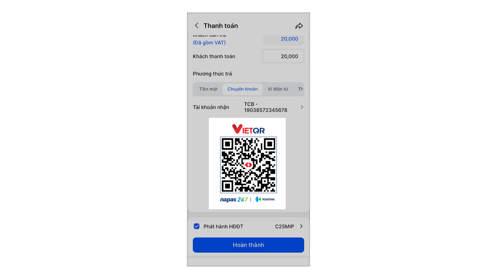 - Sau khi khách quét và chuyển khoản thành công, máy POS sẽ hiển thị thông báo và tự động in hóa đơn nếu bạn đã thiết lập.