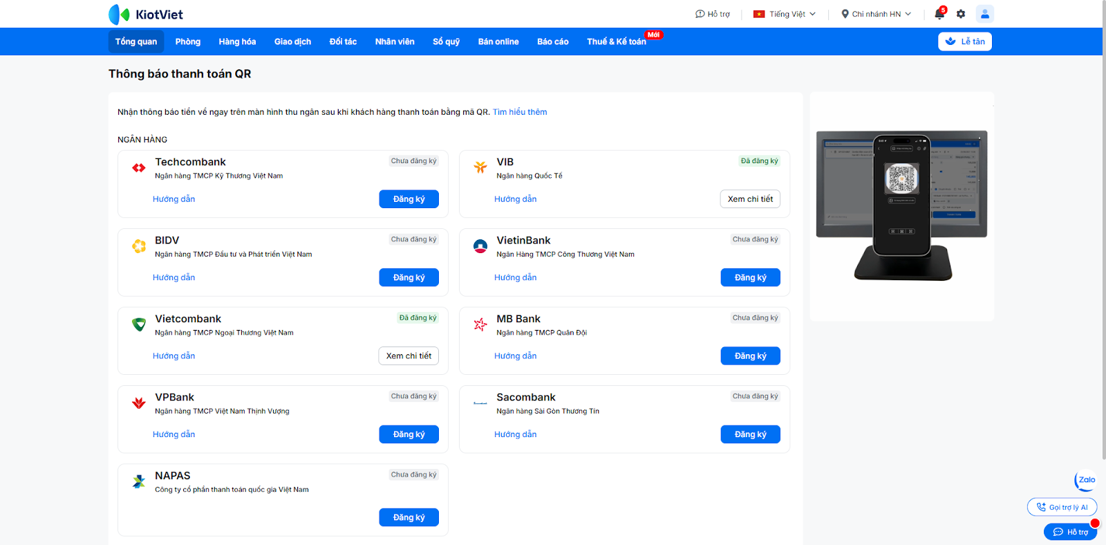 - Lưu ý: Tính năng nâng cao này áp dụng cho các ngân hàng có hợp tác với KiotViet: VIB, BIDV, Vietinbank, Vietcombank, MB Bank, VPbank, Techcombank, Sacombank,…. Để xem hướng dẫn sử dụng chi tiết, bạn vui lòng tham khảo các bài viết hướng dẫn sử dụng khác trong mục Thanh toán.