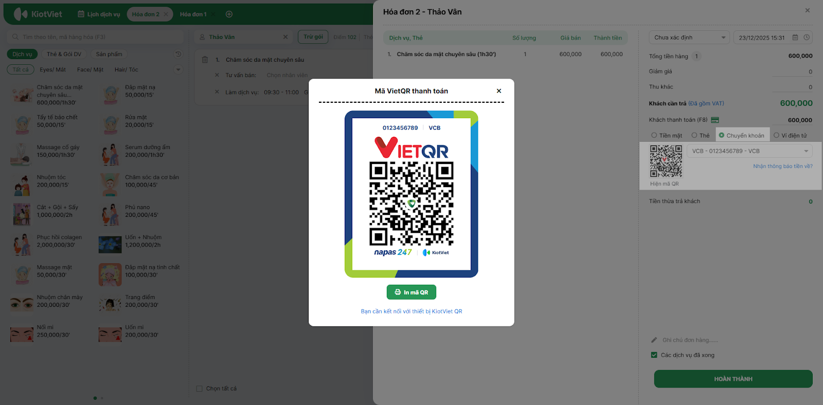 - Tình huống: Khách hàng hoàn tất dịch vụ làm tóc/massage và muốn thanh toán hóa đơn bằng cách chuyển khoản qua mã QR.
