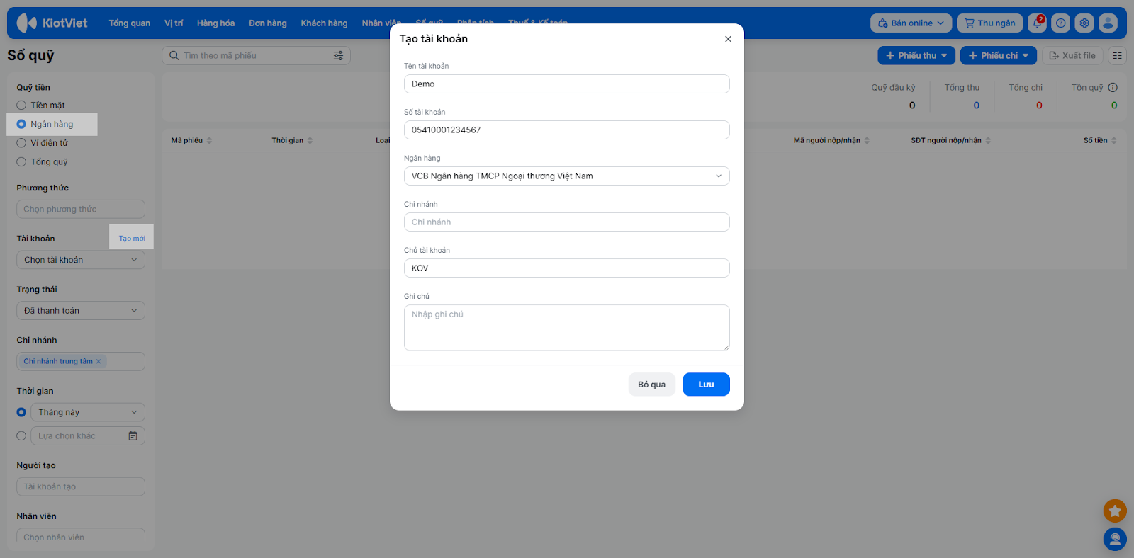 - Minh họa thao tác trên màn hình Sổ quỹ