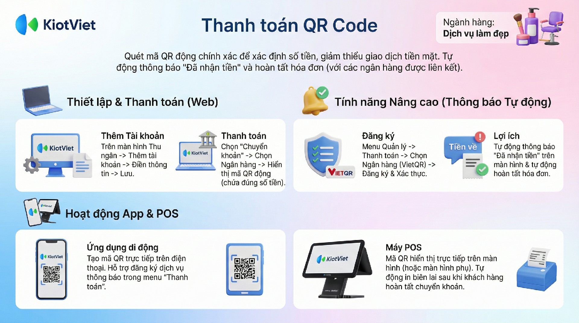 Tính năng này hỗ trợ cửa hàng tạo mã QR và nhận thông báo ngay trên thiết bị KiotViet Salon POS.