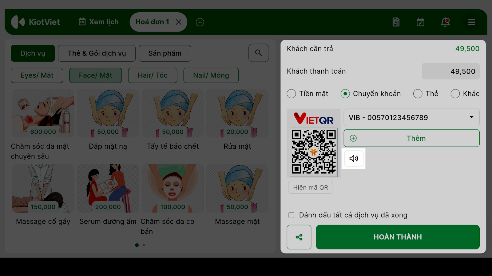 - Khi tạo hóa đơn trên ứng dụng KiotViet Salon POS, chọn phương thức thanh toán là Chuyển khoản và chọn tài khoản VIB đã liên kết.