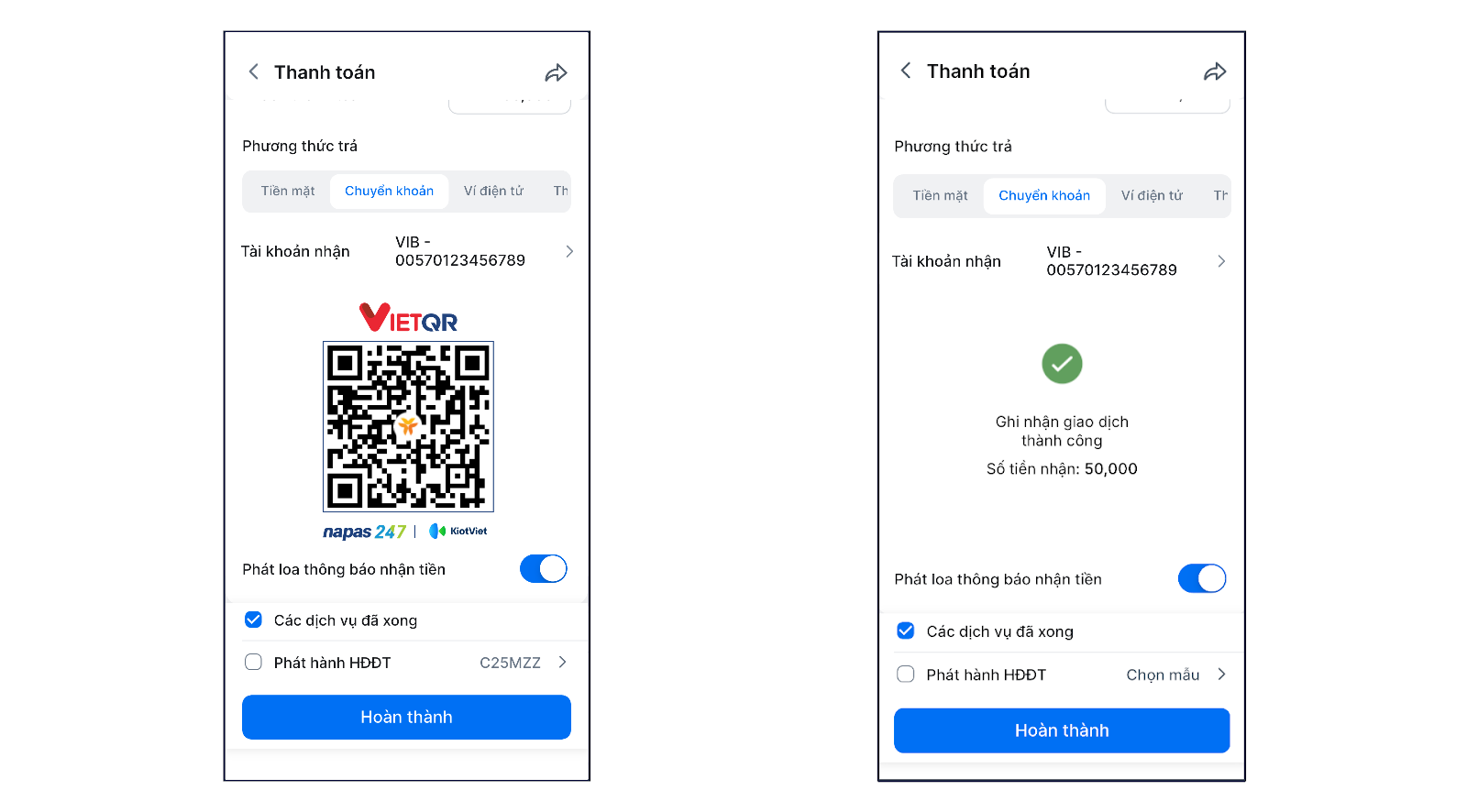 - Khi tạo hóa đơn, bạn chọn phương thức thanh toán Chuyển khoản để hiển thị mã QR của tài khoản VIB đã liên kết.