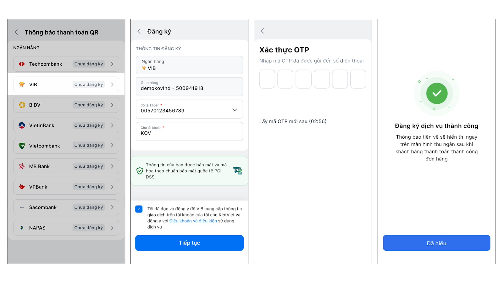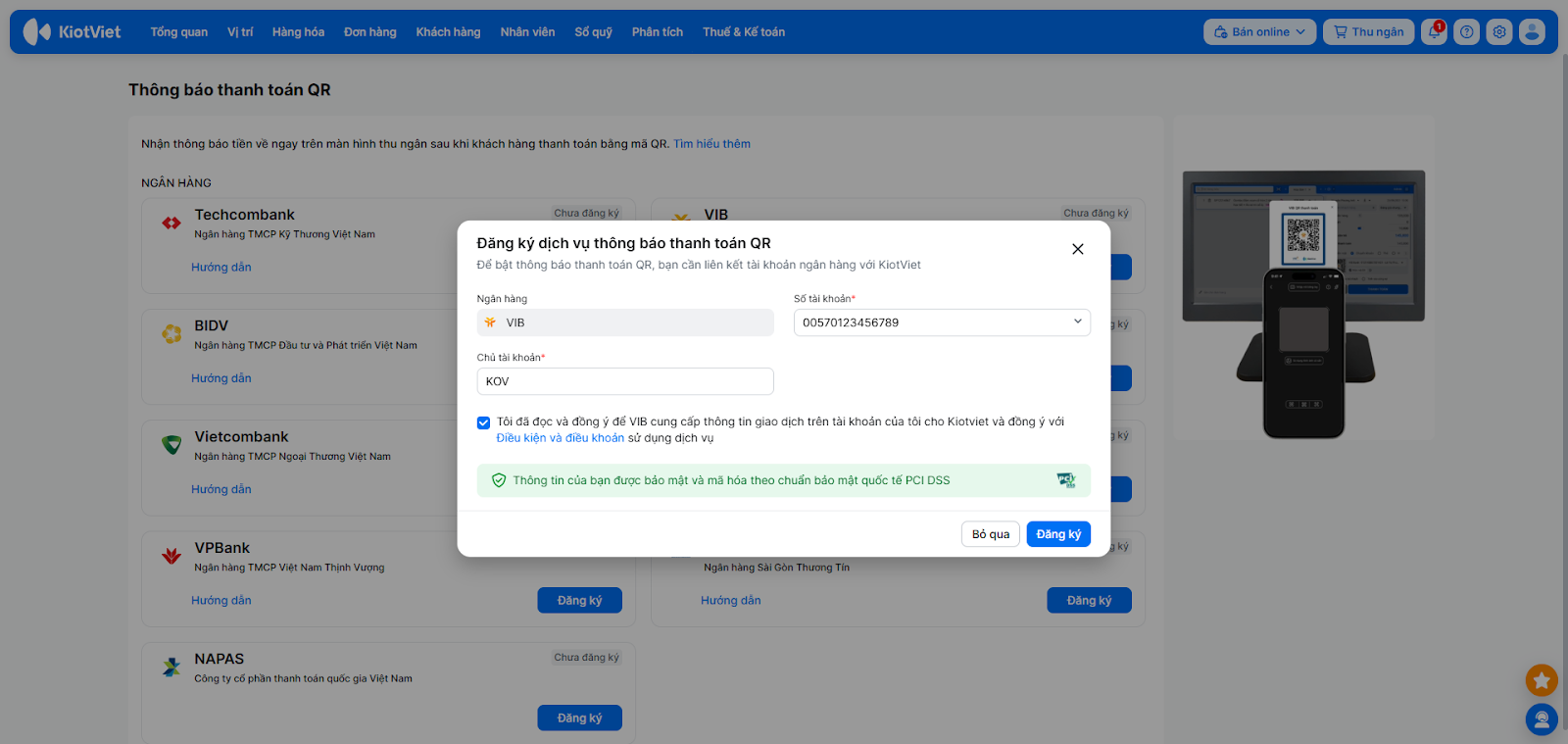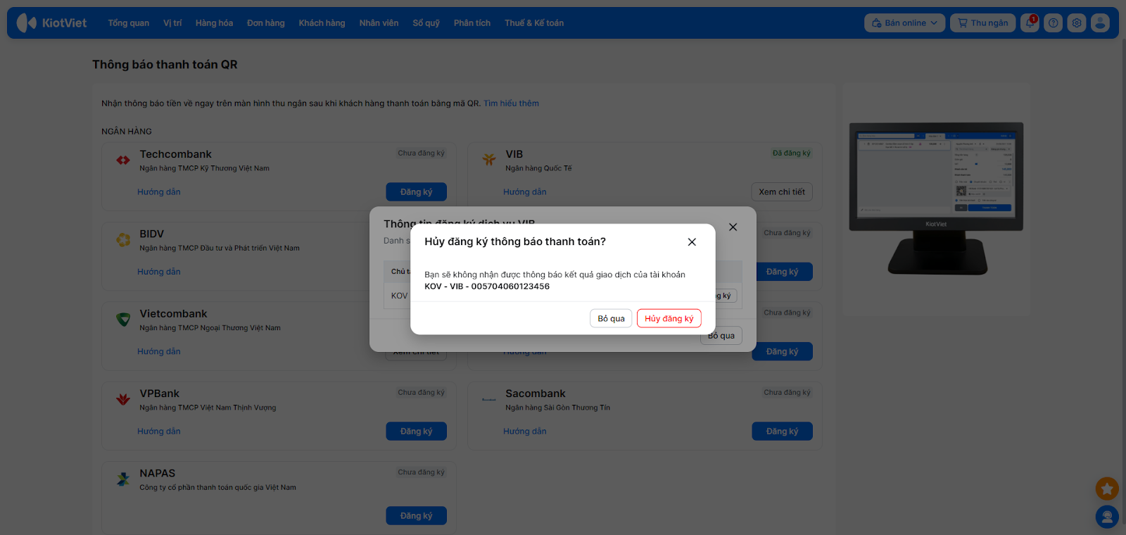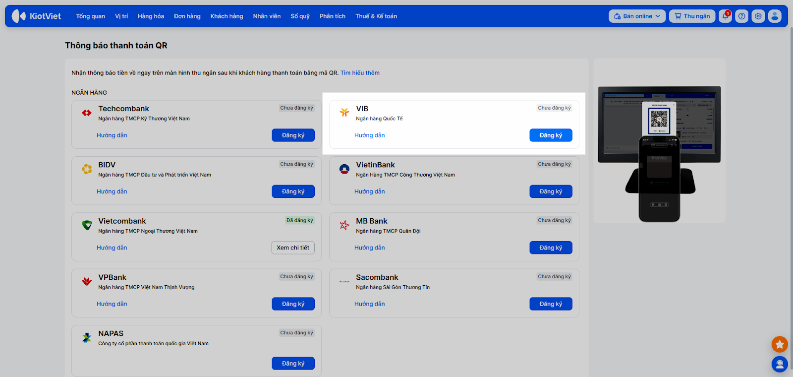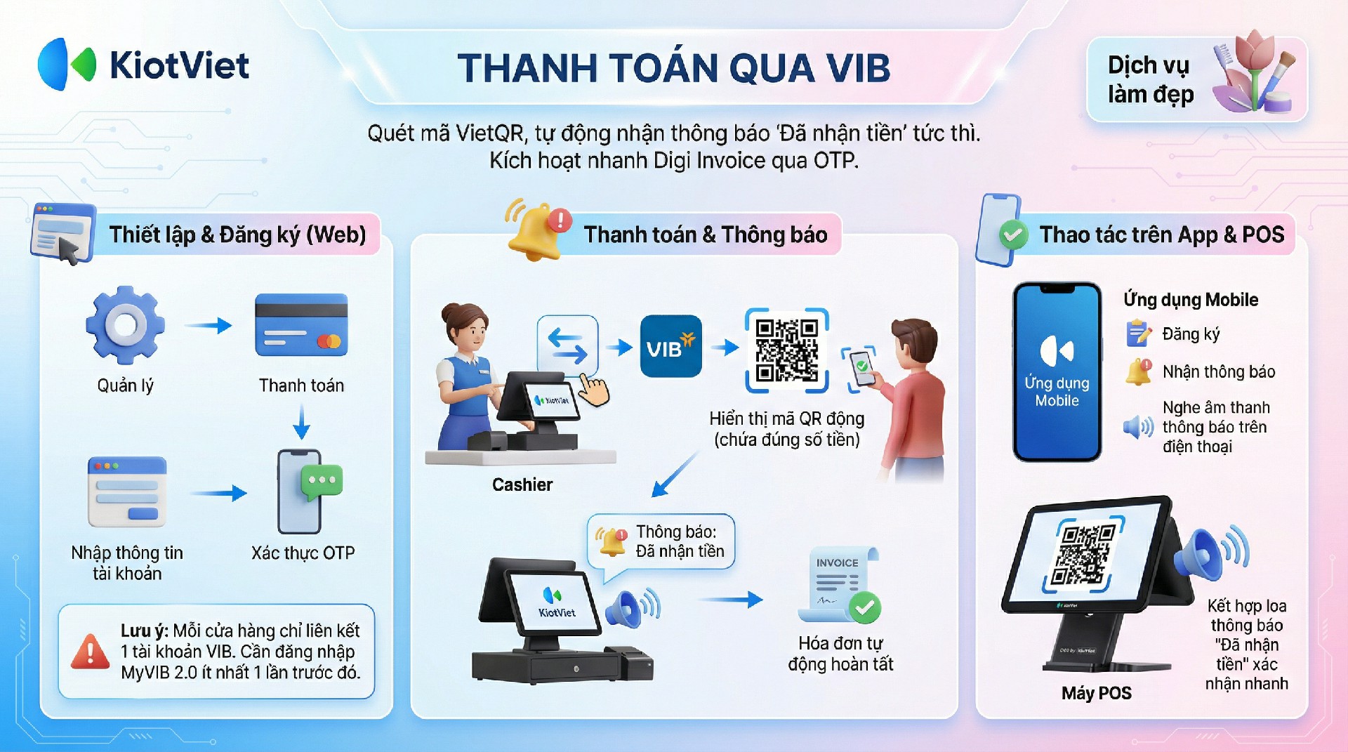 - Mỗi gian hàng KiotViet tại một thời điểm chỉ có thể liên kết với một tài khoản VIB duy nhất.