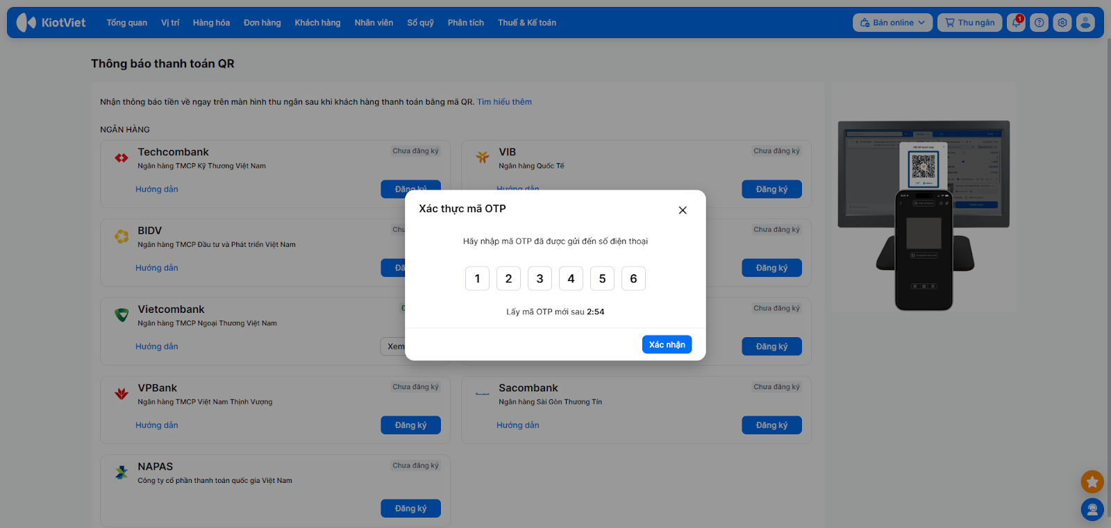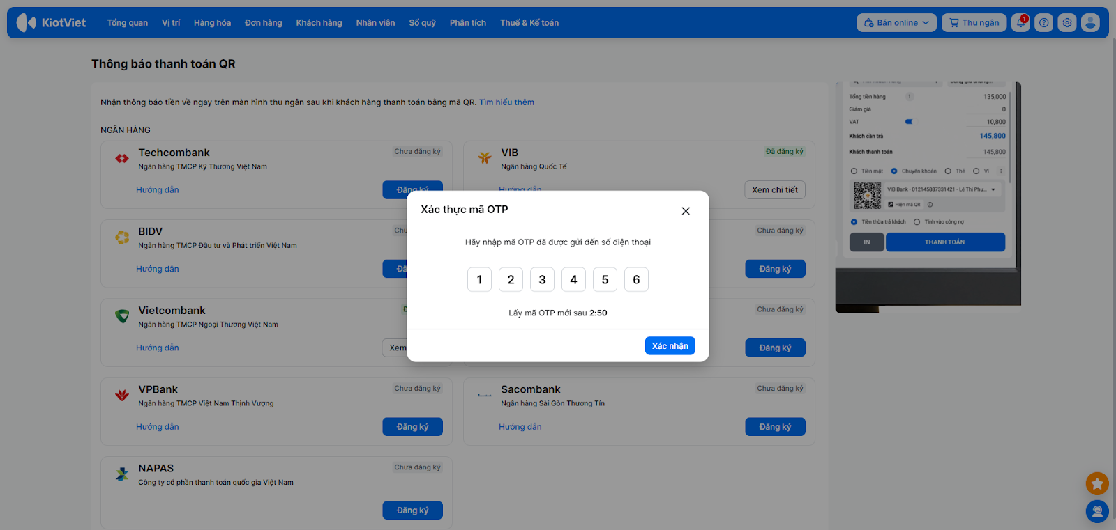 Để nhận thông báo thanh toán tự động, bạn cần kích hoạt dịch vụ trực tiếp trên phần mềm KiotViet và xác thực bằng mã OTP.