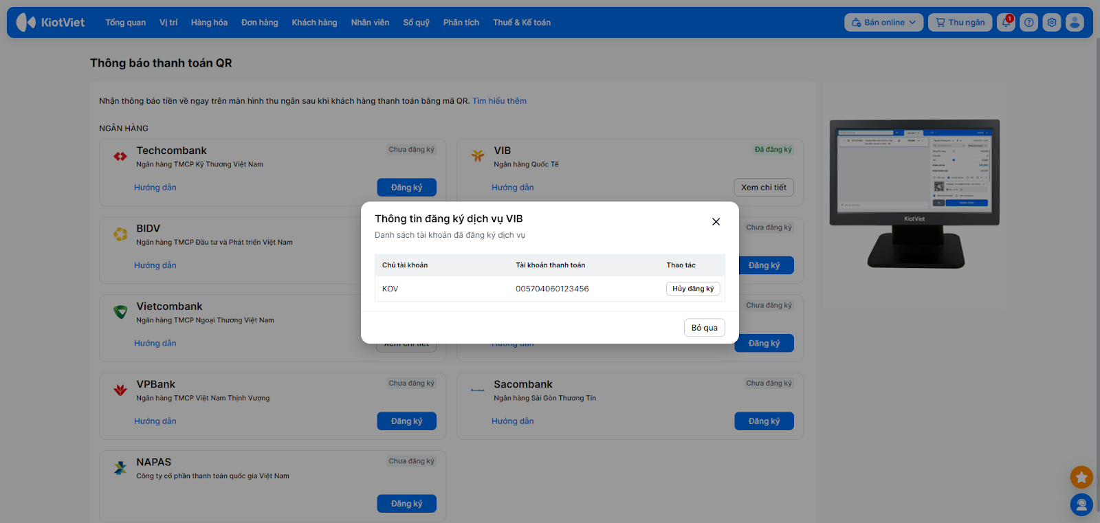 - Tình huống: Khi bạn cần kiểm tra lại thông tin tài khoản VIB nào đang được kết nối để nhận thông báo tự động trên KiotViet.
