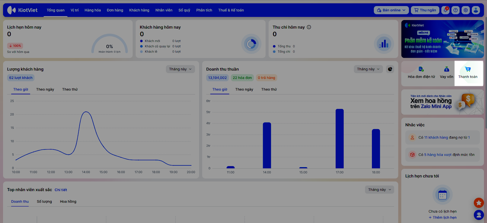 - Tại màn hình Tổng quan, vào menu Thanh toán.
