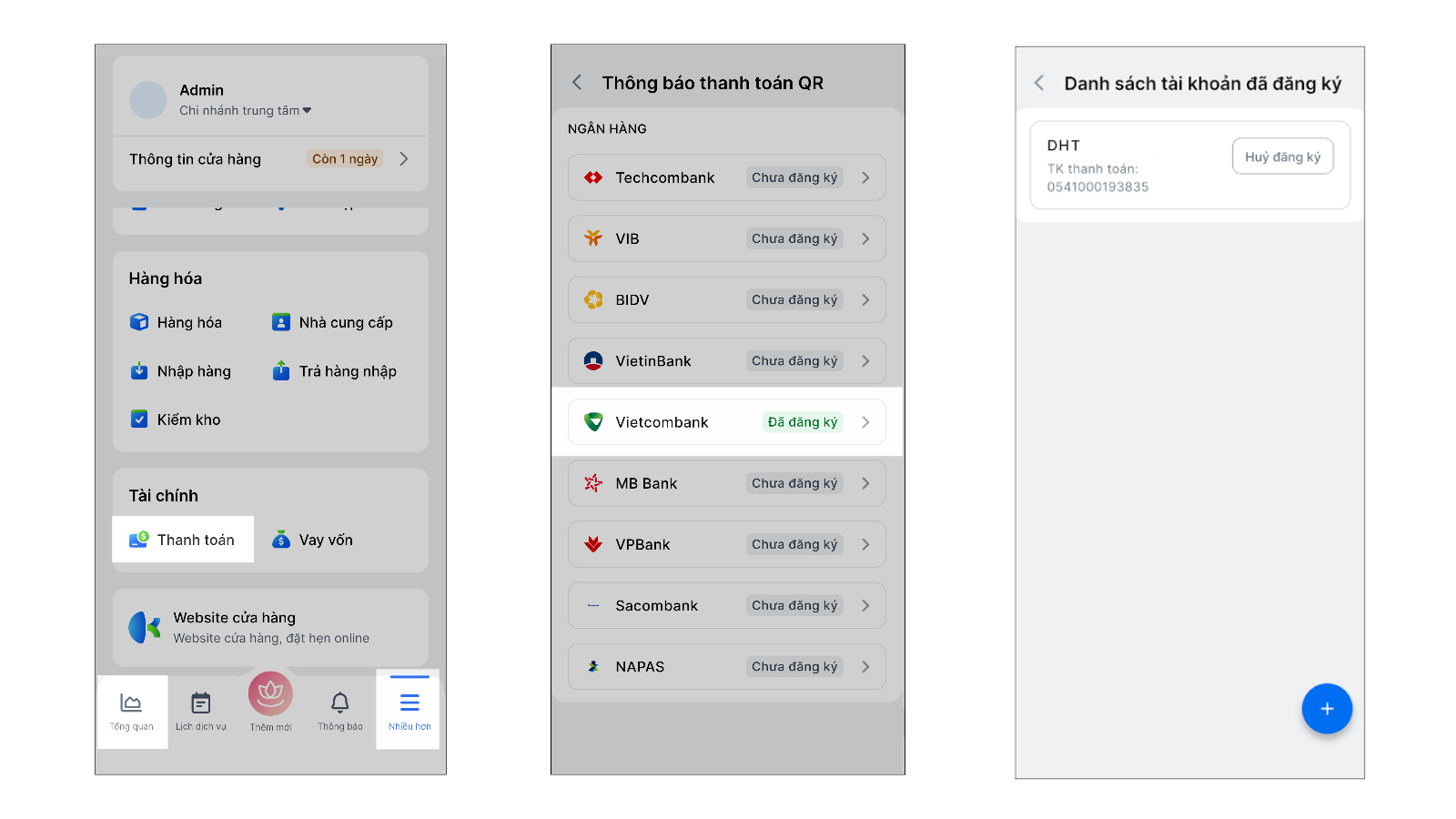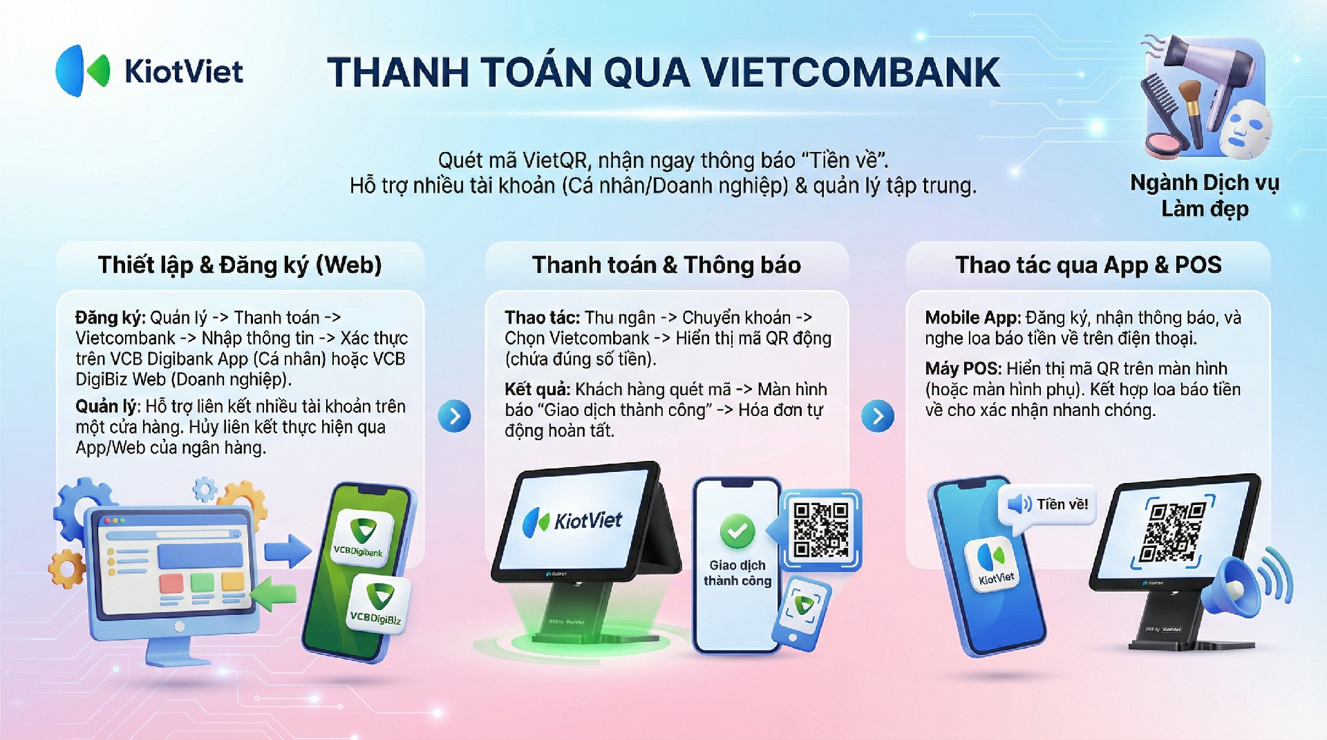 - Giúp chủ spa/salon và quản lý: Dễ dàng đăng ký và quản lý nhiều tài khoản Vietcombank trên cùng một gian hàng, giúp việc đối soát và theo dõi dòng tiền trở nên đơn giản và tập trung.