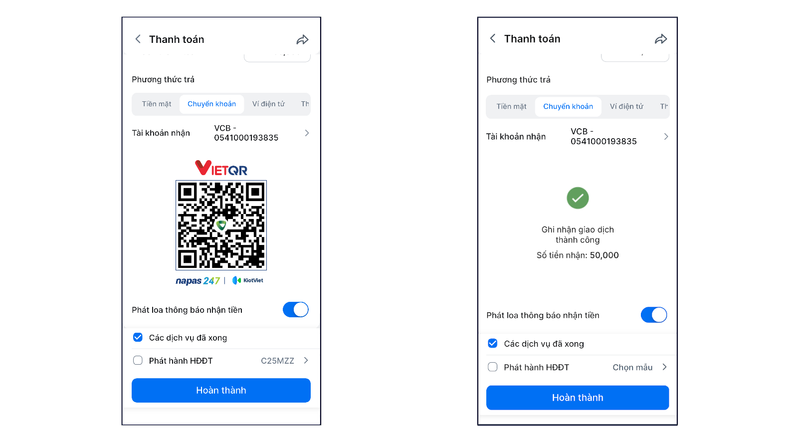 - Khi tạo hóa đơn, bạn chọn phương thức thanh toán Chuyển khoản để hiển thị mã QR của tài khoản Vietcombank đã liên kết.