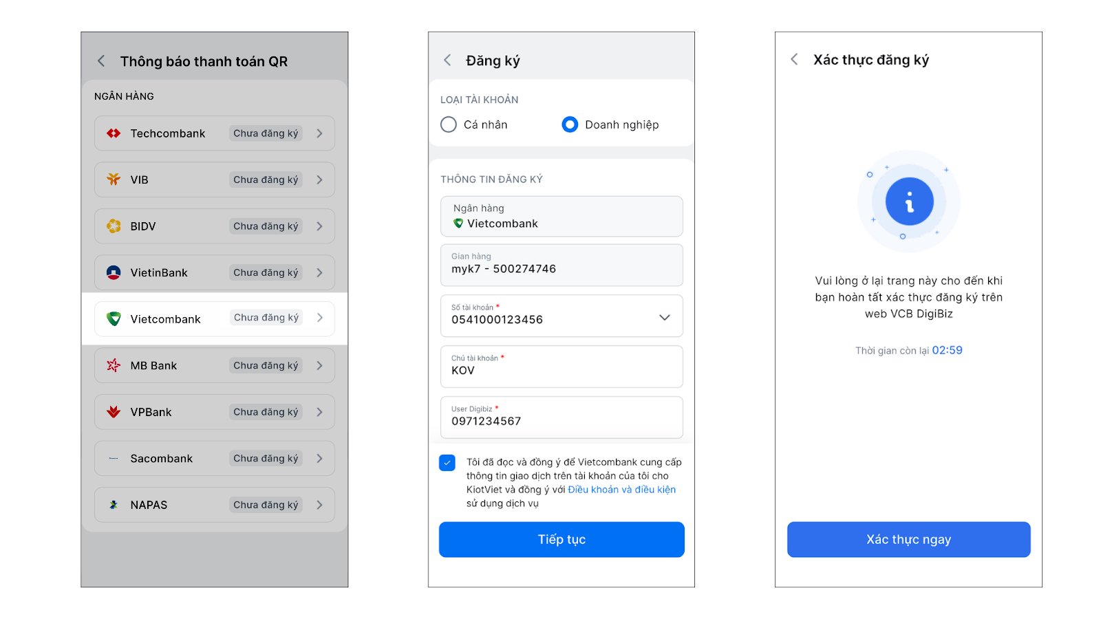 - Với tài khoản doanh nghiệp/ hộ kinh doanh: Bạn nhấn Xác thực ngay để truy cập trang web VCB DigiBiz và thực hiện theo 4 bước như trên màn hình hướng dẫn.